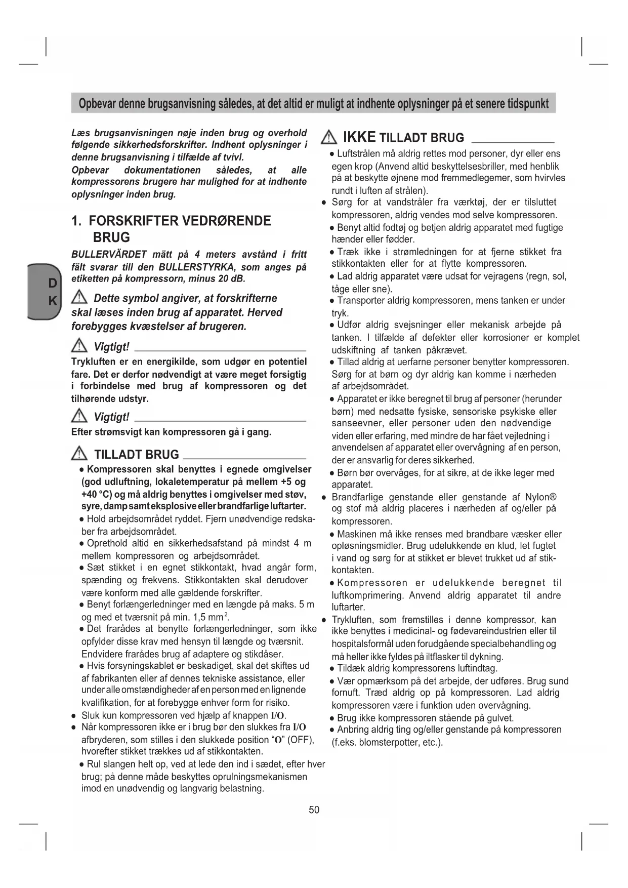BRUG BULLERVÄRDET mätt på 4 meters avstånd i fritt fält svarar till den BULLERSTYRKA, som anges på etiketten på kompressorn, minus 20 dB. Dette symbol angiver, at forskrifterne skal læses inden brug af apparatet. Herved forebygges kvæstelser af brugeren. Vigtigt! Trykluften er en energikilde, som udgør en potentiel fare. Det er derfor nødvendigt at være meget forsigtig i forbindelse med brug af kompressoren og det tilhørende udstyr. Vigtigt! Efter strømsvigt kan kompressoren gå i gang. TILLADT BRUG ● Kompressoren skal benyttes i egnede omgivelser (god udluftning, lokaletemperatur på mellem +5 og +40 °C) og må aldrig benyttes i omgivelser med støv, syre, damp samt eksplosive eller brandfarlige luftarter. ● Hold arbejdsområdet ryddet. Fjern unødvendige redska- ber fra arbejdsområdet. ● Oprethold altid en sikkerhedsafstand på mindst 4 m mellem kompressoren og arbejdsområdet. ● Sæt stikket i en egnet stikkontakt, hvad angår form, spænding og frekvens. Stikkontakten skal derudover være konform med alle gældende forskrifter. ● Benyt forlængerledninger med en længde på maks. 5 m og med et tværsnit på min. 1,5 mm