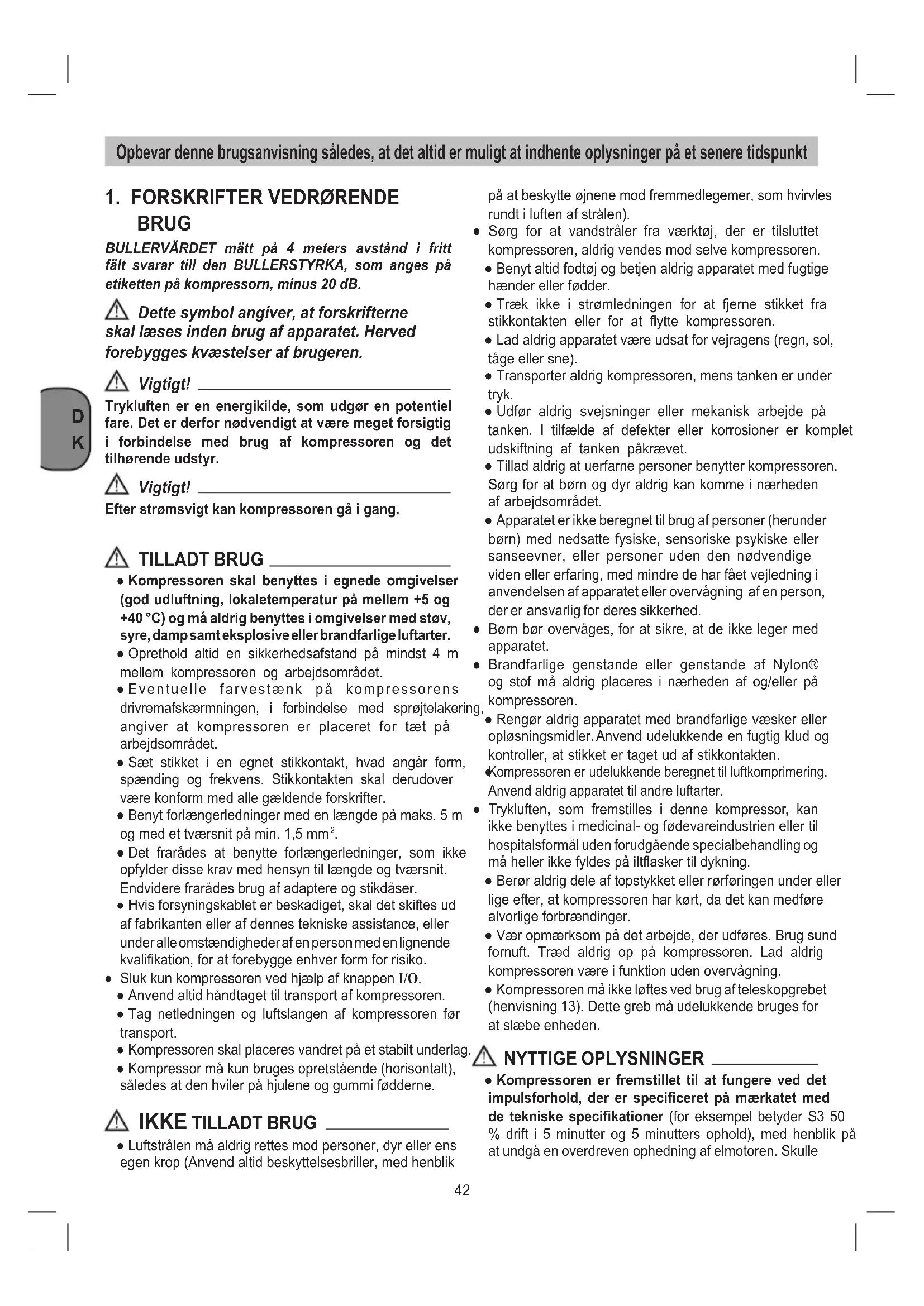 BRUG BULLERVÄRDET mätt på 4 meters avstånd i fritt fält svarar till den BULLERSTYRKA, som anges på etiketten på kompressorn, minus 20 dB. Dette symbol angiver, at forskrifterne skal læses inden brug af apparatet. Herved forebygges kvæstelser af brugeren. Vigtigt! Trykluften er en energikilde, som udgør en potentiel fare. Det er derfor nødvendigt at være meget forsigtig i forbindelse med brug af kompressoren og det tilhørende udstyr. Vigtigt! Efter strømsvigt kan kompressoren gå i gang. TILLADT BRUG ● Kompressoren skal benyttes i egnede omgivelser (god udluftning, lokaletemperatur på mellem +5 og +40 °C) og må aldrig benyttes i omgivelser med støv, syre, damp samt eksplosive eller brandfarlige luftarter. ● Oprethold altid en sikkerhedsafstand på mindst 4 m mellem kompressoren og arbejdsområdet. ● Eventuelle farvestænk på kompressorens drivremafskærmningen, i forbindelse med sprøjtelakering, angiver at kompressoren er placeret for tæt på arbejdsområdet. ● Sæt stikket i en egnet stikkontakt, hvad angår form, spænding og frekvens. Stikkontakten skal derudover være konform med alle gældende forskrifter. ● Benyt forlængerledninger med en længde på maks. 5 m og med et tværsnit på min. 1,5 mm