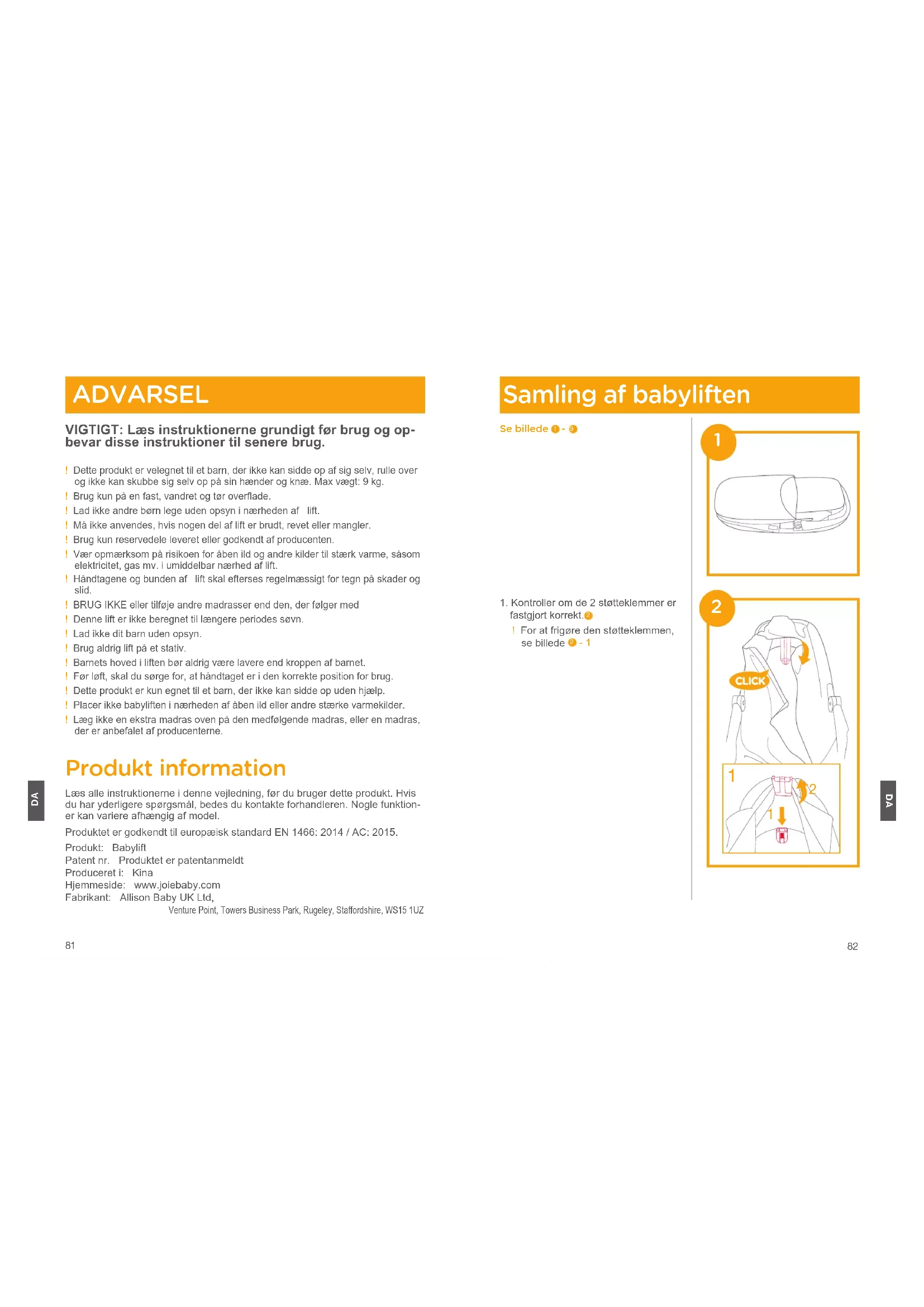 ADVARSEL VIGTIGT: Læs instruktionerne grundigt før brug og op-bevar disse instruktioner til senere brug.! Dette produkt er velegnet til et barn, der ikke kan sidde op af sig selv, rulle over og ikke kan skubbe sig selv op på sin hænder og knæ. Max vægt: 9 kg.! Brug kun på en fast, vandret og tør overflade.! Lad ikke andre børn lege uden opsyn i nærheden af lift.! Må ikke anvendes, hvis nogen del af lift er brudt, revet eller mangler.! Brug kun reservedele leveret eller godkendt af producenten.! Vær opmærksom på risikoen for åben ild og andre kilder til stærk varme, såsom elektricitet, gas mv. i umiddelbar nærhed af lift.! Håndtagene og bunden af lift skal efterses regelmæssigt for tegn på skader og slid.! BRUG IKKE eller tilføje andre madrasser end den, der følger med! Denne lift er ikke beregnet til længere periodes søvn.! Lad ikke dit barn uden opsyn.! Brug aldrig lift på et stativ.! Barnets hoved i liften bør aldrig være lavere end kroppen af barnet.! Før løft, skal du sørge for, at håndtaget er i den korrekte position for brug. ! Dette produkt er kun egnet til et barn, der ikke kan sidde op uden hjælp.! Placer ikke babyliften i nærheden af åben ild eller andre stærke varmekilder.! Læg ikke en ekstra madras oven på den medfølgende madras, eller en madras, der er anbefalet af producenterne. Produkt information Læs alle instruktionerne i denne vejledning, før du bruger dette produkt. Hvis du har yderligere spørgsmål, bedes du kontakte forhandleren. Nogle funktion-er kan variere afhængig af model.Produktet er godkendt til europæisk standard EN 1466: 2014 / AC: 2015. Produkt: BabyliftPatent nr. Produktet er patentanmeldtProduceret i: KinaHjemmeside: www.joiebaby.comFabrikant: Allison Baby UK Ltd, Venture Point, Towers Business Park, Rugeley, Staffordshire, WS15 1UZ Samling af babyliften Se billede