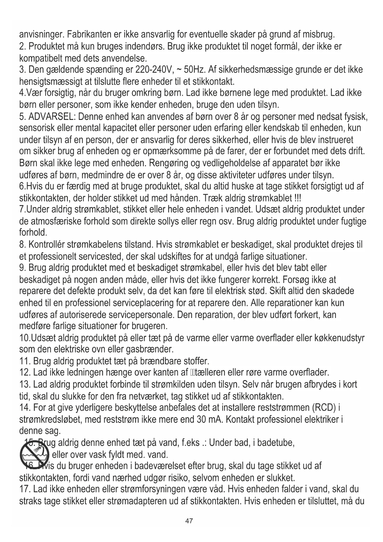 15. Brug aldrig denne enhed tæt på vand, f.eks .: Under bad, i badetube,
