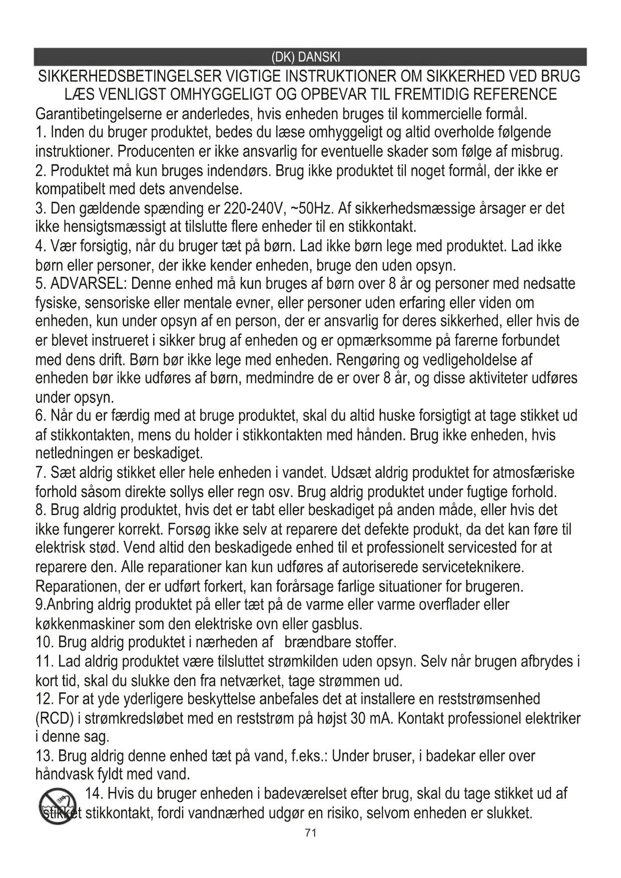 13. Brug aldrig denne enhed tæt på vand, f.eks.: Under bruser, i badekar eller over