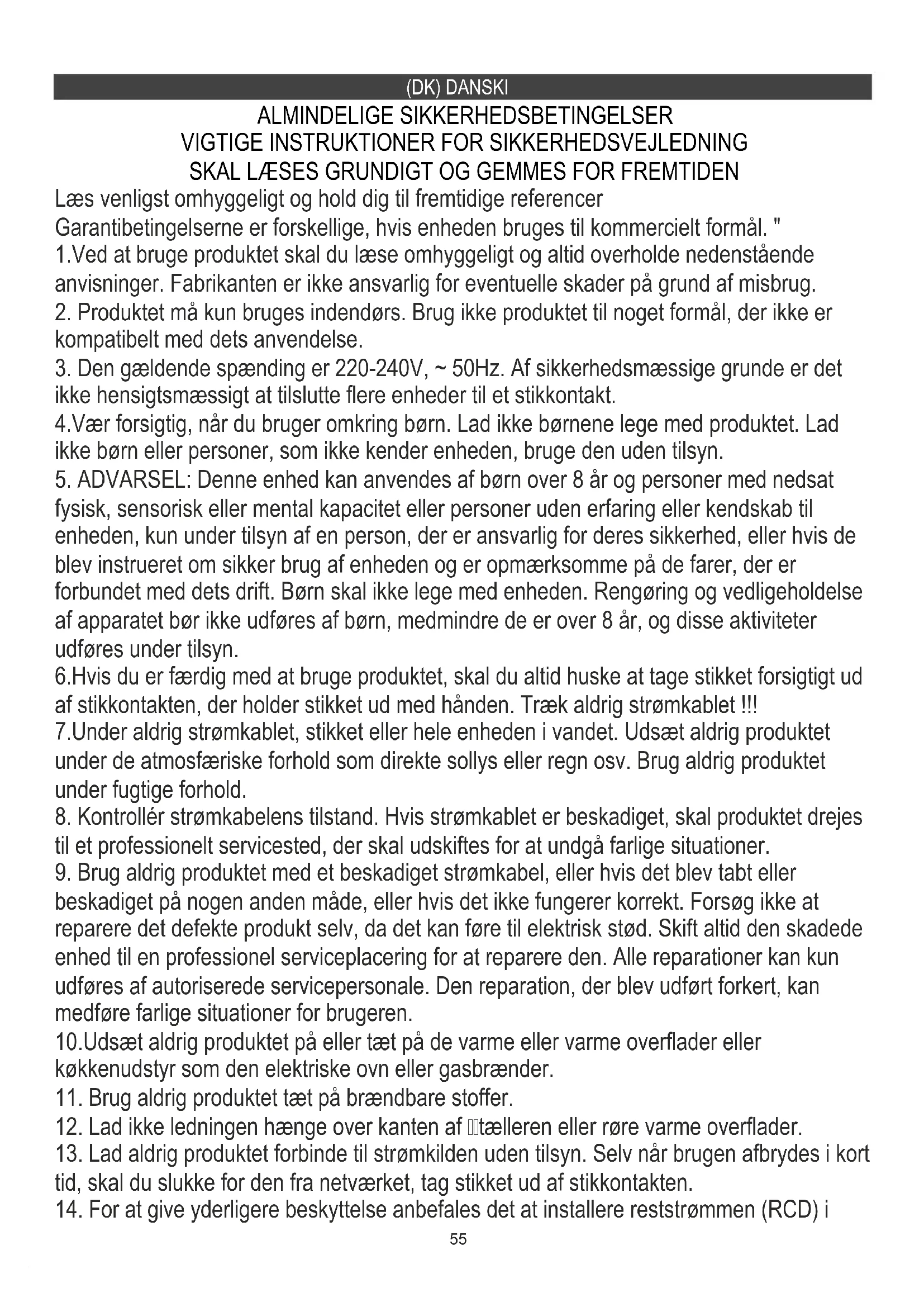 SKAL LÆSES GRUNDIGT OG GEMMES FOR FREMTIDEN Læs venligst omhyggeligt og hold dig til fremtidige referencer Garantibetingelserne er forskellige, hvis enheden bruges til kommercielt formål. " 1.Ved at bruge produktet skal du læse omhyggeligt og altid overholde nedenstående anvisninger. Fabrikanten er ikke ansvarlig for eventuelle skader på grund af misbrug.