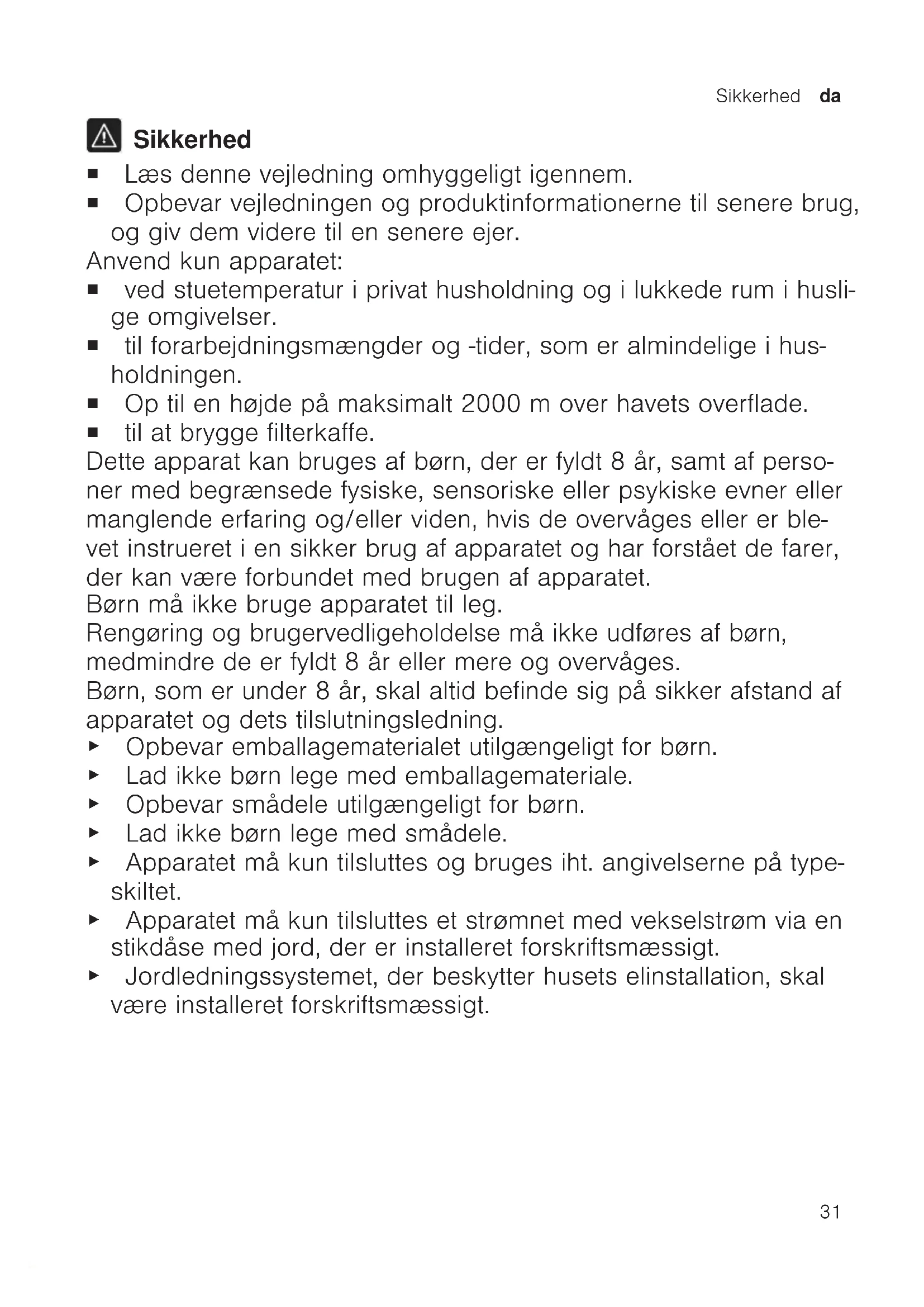 Sikkerhed ¡ Læs denne vejledning omhyggeligt igennem. ¡ Opbevar vejledningen og produktinformationerne til senere brug, og giv dem videre til en senere ejer. Anvend kun apparatet: ¡ ved stuetemperatur i privat husholdning og i lukkede rum i husli- ge omgivelser. ¡ til forarbejdningsmængder og -tider, som er almindelige i hus- holdningen. ¡ Op til en højde på maksimalt 2000m over havets overflade. ¡ til at brygge filterkaffe. Dette apparat kan bruges af børn, der er fyldt 8 år, samt af perso- ner med begrænsede fysiske, sensoriske eller psykiske evner eller manglende erfaring og/eller viden, hvis de overvåges eller er ble- vet instrueret i en sikker brug af apparatet og har forstået de farer, der kan være forbundet med brugen af apparatet. Børn må ikke bruge apparatet til leg. Rengøring og brugervedligeholdelse må ikke udføres af børn, medmindre de er fyldt 8 år eller mere og overvåges. Børn, som er under 8 år, skal altid befinde sig på sikker afstand af apparatet og dets tilslutningsledning. ▶ Opbevar emballagematerialet utilgængeligt for børn. ▶ Lad ikke børn lege med emballagemateriale. ▶ Opbevar smådele utilgængeligt for børn. ▶ Lad ikke børn lege med smådele. ▶ Apparatet må kun tilsluttes og bruges iht. angivelserne på type- skiltet. ▶ Apparatet må kun tilsluttes et strømnet med vekselstrøm via en stikdåse med jord, der er installeret forskriftsmæssigt. ▶ Jordledningssystemet, der beskytter husets elinstallation, skal være installeret forskriftsmæssigt.da Sikkerhed