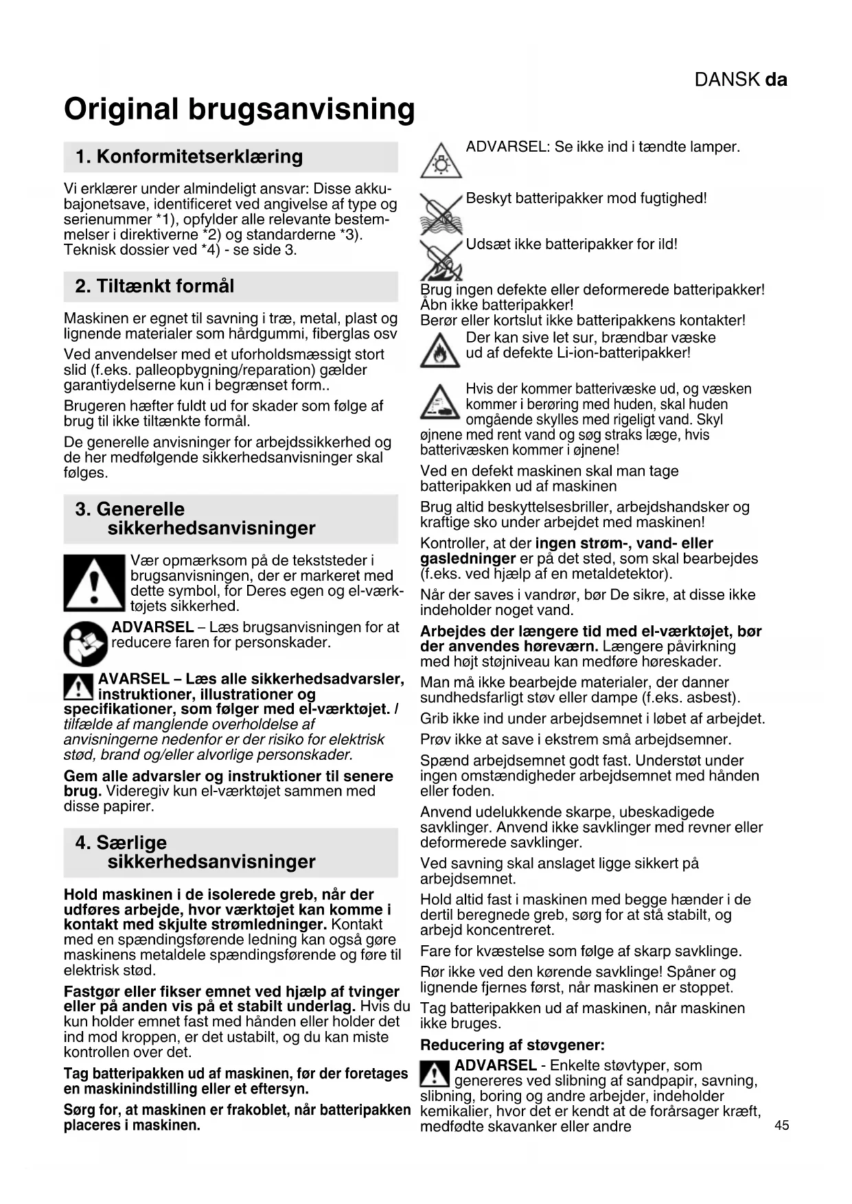 Original brugsanvisning Vi erklærer under almindeligt ansvar: Disse akku- bajonetsave, identificeret ved angivelse af type og serienummer *1), opfylder alle relevante bestem- melser i direktiverne *2) og standarderne *3). Teknisk dossier ved *4) - se side 3. Maskinen er egnet til savning i træ, metal, plast og lignende materialer som hårdgummi, fiberglas osv Ved anvendelser med et uforholdsmæssigt stort slid (f.eks. palleopbygning/reparation) gælder garantiydelserne kun i begrænset form.. Brugeren hæfter fuldt ud for skader som følge af brug til ikke tiltænkte formål. De generelle anvisninger for arbejdssikkerhed og de her medfølgende sikkerhedsanvisninger skal følges. Vær opmærksom på de tekststeder i brugsanvisningen, der er markeret med dette symbol, for Deres egen og el-værk- tøjets sikkerhed. ADVARSEL – Læs brugsanvisningen for at reducere faren for personskader. AVARSEL – Læs alle sikkerhedsadvarsler, instruktioner, illustrationer og specifikationer, som følger med el-værktøjet. I tilfælde af manglende overholdelse af anvisningerne nedenfor er der risiko for elektrisk stød, brand og/eller alvorlige personskader. Gem alle advarsler og instruktioner til senere brug. Videregiv kun el-værktøjet sammen med disse papirer. Hold maskinen i de isolerede greb, når der udføres arbejde, hvor værktøjet kan komme i kontakt med skjulte strømledninger. Kontakt med en spændingsførende ledning kan også gøre maskinens metaldele spændingsførende og føre til elektrisk stød. Fastgør eller fikser emnet ved hjælp af tvinger eller på anden vis på et stabilt underlag. Hvis du kun holder emnet fast med hånden eller holder det ind mod kroppen, er det ustabilt, og du kan miste kontrollen over det. Tag batteripakken ud af maskinen, før der foretages en maskinindstilling eller et eftersyn. Sørg for, at maskinen er frakoblet, når batteripakken placeres i maskinen. ADVARSEL: Se ikke ind i tændte lamper. Beskyt batteripakker mod fugtighed! Udsæt ikke batteripakker for ild! Brug ingen defekte eller deformerede batteripakker! Åbn ikke batteripakker! Berør eller kortslut ikke batteripakkens kontakter! Der kan sive let sur, brændbar væske ud af defekte Li-ion-batteripakker! Hvis der kommer batterivæske ud, og væsken kommer i berøring med huden, skal huden omgående skylles med rigeligt vand. Skyl øjnene med rent vand og søg straks læge, hvis batterivæsken kommer i øjnene! Ved en defekt maskinen skal man tage batteripakken ud af maskinen Brug altid beskyttelsesbriller, arbejdshandsker og kraftige sko under arbejdet med maskinen! Kontroller, at der ingen strøm-, vand- eller gasledninger er på det sted, som skal bearbejdes (f.eks. ved hjælp af en metaldetektor). Når der saves i vandrør, bør De sikre, at disse ikke indeholder noget vand. Arbejdes der længere tid med el-værktøjet, bør der anvendes høreværn. Længere påvirkning med højt støjniveau kan medføre høreskader. Man må ikke bearbejde materialer, der danner sundhedsfarligt støv eller dampe (f.eks. asbest). Grib ikke ind under arbejdsemnet i løbet af arbejdet. Prøv ikke at save i ekstrem små arbejdsemner. Spænd arbejdsemnet godt fast. Understøt under ingen omstændigheder arbejdsemnet med hånden eller foden. Anvend udelukkende skarpe, ubeskadigede savklinger. Anvend ikke savklinger med revner eller deformerede savklinger. Ved savning skal anslaget ligge sikkert på arbejdsemnet. Hold altid fast i maskinen med begge hænder i de dertil beregnede greb, sørg for at stå stabilt, og arbejd koncentreret. Fare for kvæstelse som følge af skarp savklinge. Rør ikke ved den kørende savklinge! Spåner og lignende fjernes først, når maskinen er stoppet. Tag batteripakken ud af maskinen, når maskinen ikke bruges. Reducering af støvgener: ADVARSEL - Enkelte støvtyper, som genereres ved slibning af sandpapir, savning, slibning, boring og andre arbejder, indeholder kemikalier, hvor det er kendt at de forårsager kræft, medfødte skavanker eller andre