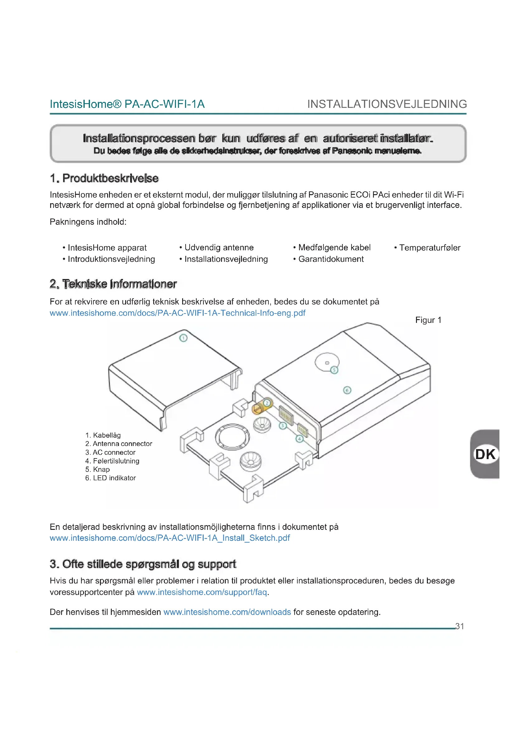 IntesisHome enheden er et eksternt modul, der muliggør tilslutning af Panasonic ECOi PAci enheder til dit Wi-Fi netværk for dermed at opnå global forbindelse og fjernbetjening af applikationer via et brugervenligt interface. Pakningens indhold: For at rekvirere en udførlig teknisk beskrivelse af enheden, bedes du se dokumentet på www.intesishome.com/docs/PA-AC-WIFI-1A-Technical-Info-eng.pdf En detaljerad beskrivning av installationsmöjligheterna nns i dokumentet på www.intesishome.com/docs/PA-AC-WIFI-1A_Install_Sketch.pdf Hvis du har spørgsmål eller problemer i relation til produktet eller installationsproceduren, bedes du besøge voressupportcenter på www.intesishome.com/support/faq. Der henvises til hjemmesiden www.intesishome.com/downloads for seneste opdatering. Installationsprocessen bør kun udføres af en autoriseret installatør. Du bedes følge alle de sikkerhedsinstrukser, der foreskrives af Panasonic manualerne.
