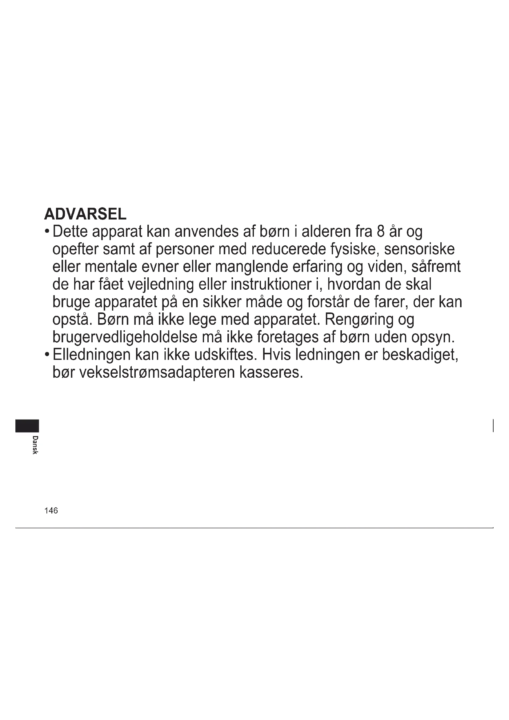 Dette apparat kan anvendes af børn i alderen fra 8 år og opefter samt af personer med reducerede fysiske, sensoriske eller mentale evner eller manglende erfaring og viden, såfremt de har fået vejledning eller instruktioner i, hvordan de skal bruge apparatet på en sikker måde og forstår de farer, der kan opstå. Børn må ikke lege med apparatet. Rengøring og brugervedligeholdelse må ikke foretages af børn uden opsyn.