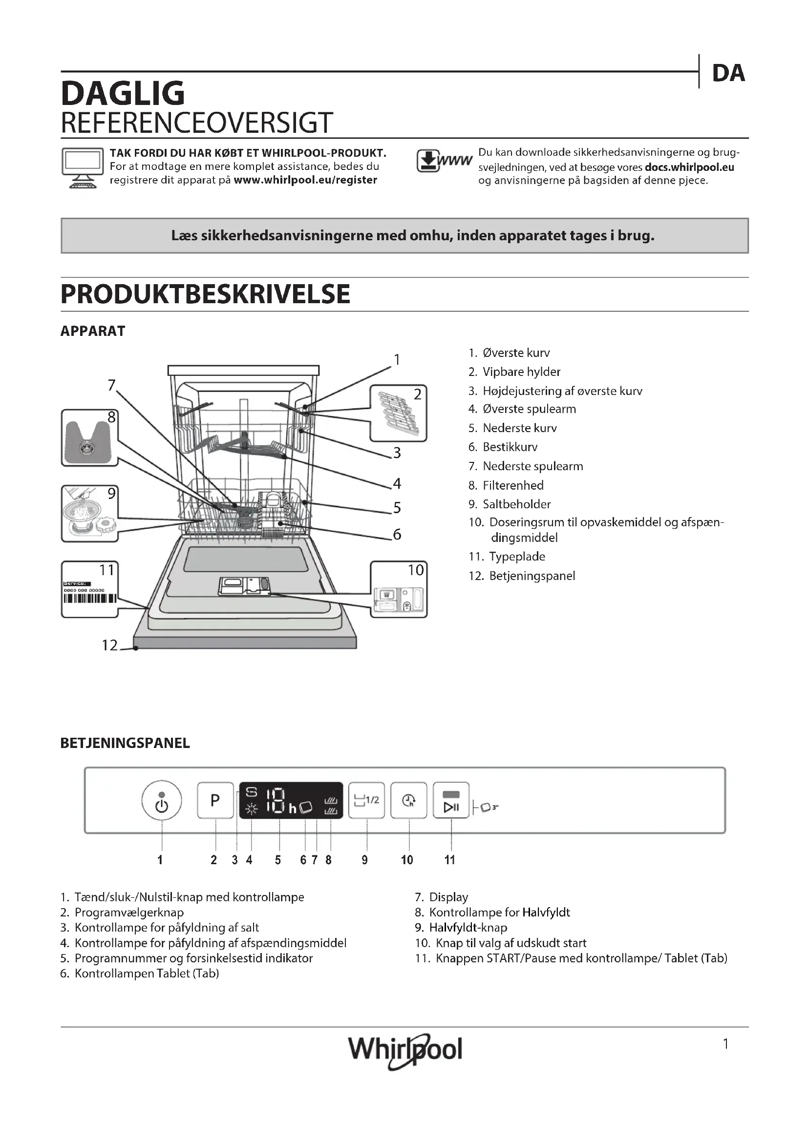 DAGLIG REFERENCEOVERSIGT TAK FORDI DU HAR KØBT ET WHIRLPOOL-PRODUKT.For at modtage en mere komplet assistance, bedes du registrere dit apparat på www.whirlpool.eu/registerLæs sikkerhedsanvisningerne med omhu, inden apparatet tages i brug. PRODUKTBESKRIVELSE APPARATBETJENINGSPANELDu kan downloade sikkerhedsanvisningerne og brug-svejledningen, ved at besøge vores docs.whirlpool.eu og anvisningerne på bagsiden af denne pjece. 1. Øverste kurv2. Vipbare hylder3. Højdejustering af øverste kurv4. Øverste spulearm5. Nederste kurv6. Bestikkurv7. Nederste spulearm8. Filterenhed9. Saltbeholder10. Doseringsrum til opvaskemiddel og afspæn-dingsmiddel11. Typeplade12. Betjeningspanel0000 000 00000 Service: