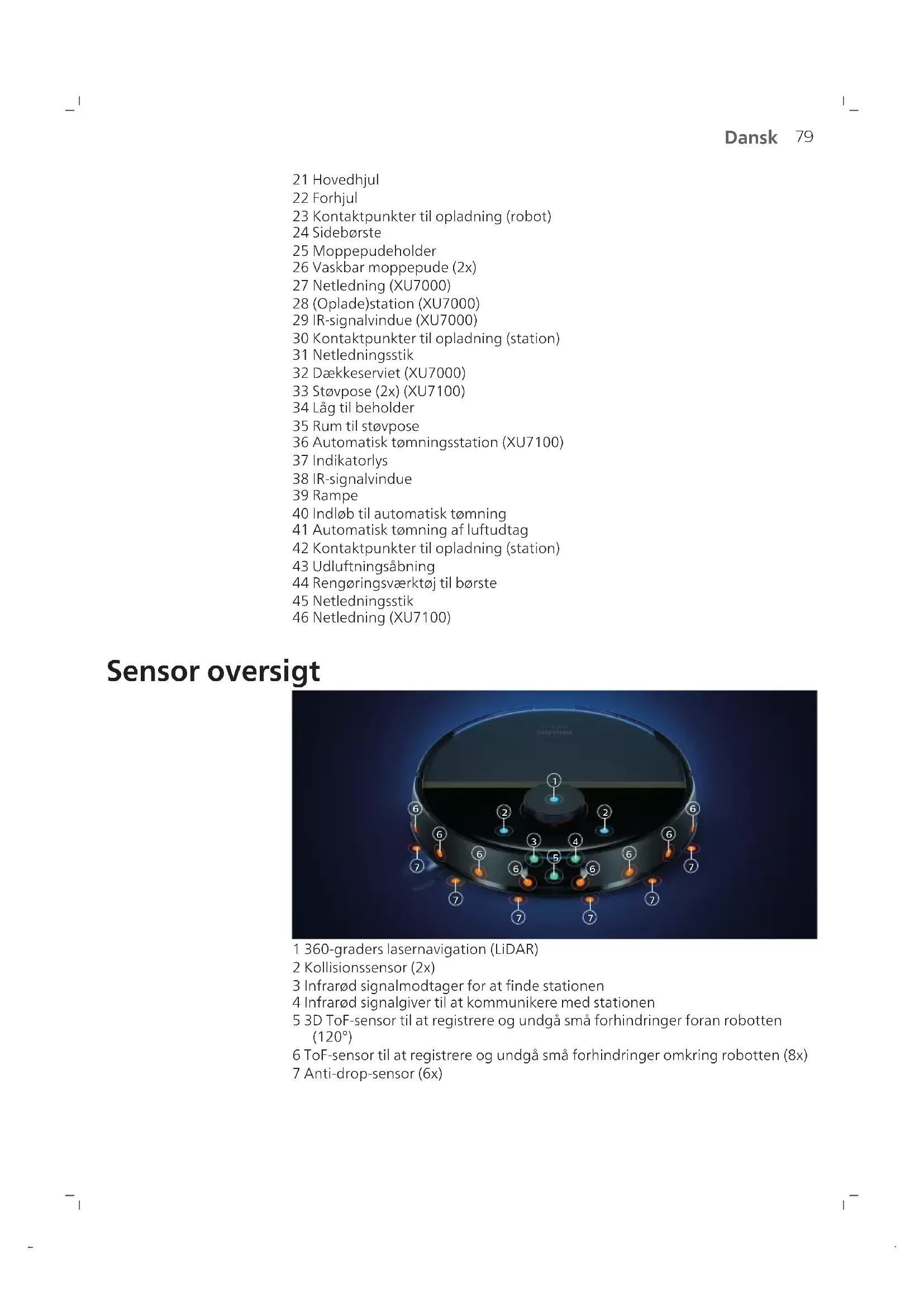 Dansk Indhold Introduktion ______________________________________________________________________________ 78 Produktoversigt ___________________________________________________________________________ 78 Sensor oversigt ____________________________________________________________________________ 79 Før apparatet tages i brug ___________________________________________________________________ 80 Klargøring_________________________________________________________________________________ 80 Hørbare signaler ___________________________________________________________________________ 85 Sådan fungerer din robot ___________________________________________________________________ 85 Sådan bruges din robot _____________________________________________________________________ 90 Rengøring og vedligeholdelse _______________________________________________________________ 93 Brugergrænsefladesignaler og deres betydning ________________________________________________ 104 Nulstil/gendan robotten ____________________________________________________________________ 106 Udskiftning________________________________________________________________________________ 106 Reklamationsret og support _________________________________________________________________ 108 Bortskaffelse og genbrug____________________________________________________________________ 109 Fejlfinding_________________________________________________________________________________ 109 Introduktion Tillykke med dit køb af en robotstøvsuger og -moppe i Philips HomeRun Aqua 7000-serien! For at få mest muligt ud af din robot og få adgang til alle de avancerede funktioner kan du downloade og installere Philips HomeRun- robotappen. Du kan også finde supportvideoer og ofte stillede spørgsmål i appen. Læs den separate garantifolder grundigt, før du bruger maskinen for første gang, og gem den til senere brug. Produktoversigt 1 Støvbeholder 2 Vaskbart filter 3 Låg på det vaskbare filter 4 Filterlås 5 Filterlåglås 6 Låg til tømning af støvbeholder 7 Udløs knapperne på støvbeholderen 8 Afbryderknap 9 Home-knap 10 Reset-knap (nulstilling) 11 Topdæksel 12 Stødfanger 13 Vakuum indløb 14 Luftudtag 15 Vandtank 16 Frigør knap på vandtanken 17 Vandindløb 18 Hovedbørste 19 Børstecover 20 Slip knapperne på børstecoveret79 Dansk 21 Hovedhjul 22 Forhjul 23 Kontaktpunkter til opladning (robot) 24 Sidebørste 25 Moppepudeholder 26 Vaskbar moppepude (2x) 27 Netledning (XU7000) 28 (Oplade)station (XU7000) 29 IR-signalvindue (XU7000) 30 Kontaktpunkter til opladning (station) 31 Netledningsstik 32 Dækkeserviet (XU7000) 33 Støvpose (2x) (XU7100) 34 Låg til beholder 35 Rum til støvpose 36 Automatisk tømningsstation (XU7100) 37 Indikatorlys 38 IR-signalvindue 39 Rampe 40 Indløb til automatisk tømning 41 Automatisk tømning af luftudtag 42 Kontaktpunkter til opladning (station) 43 Udluftningsåbning 44 Rengøringsværktøj til børste 45 Netledningsstik 46 Netledning (XU7100) Sensor oversigt