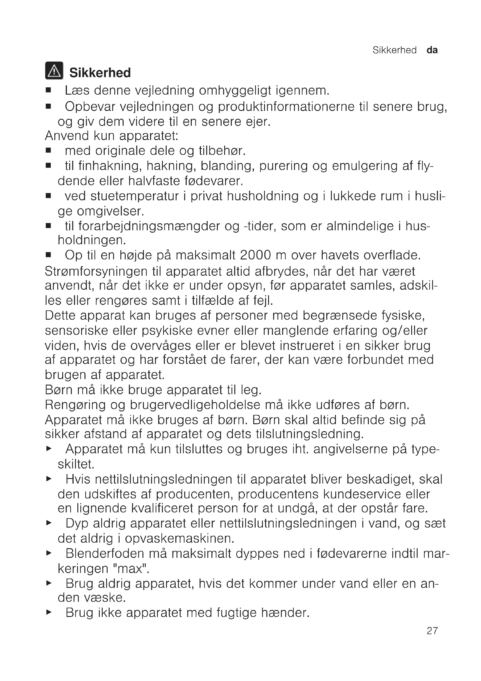 Sikkerhed ¡ Læs denne vejledning omhyggeligt igennem. ¡ Opbevar vejledningen og produktinformationerne til senere brug, og giv dem videre til en senere ejer. Anvend kun apparatet: ¡ med originale dele og tilbehør. ¡ til finhakning, hakning, blanding, purering og emulgering af fly- dende eller halvfaste fødevarer. ¡ ved stuetemperatur i privat husholdning og i lukkede rum i husli- ge omgivelser. ¡ til forarbejdningsmængder og -tider, som er almindelige i hus- holdningen. ¡ Op til en højde på maksimalt 2000m over havets overflade. Strømforsyningen til apparatet altid afbrydes, når det har været anvendt, når det ikke er under opsyn, før apparatet samles, adskil- les eller rengøres samt i tilfælde af fejl. Dette apparat kan bruges af personer med begrænsede fysiske, sensoriske eller psykiske evner eller manglende erfaring og/eller viden, hvis de overvåges eller er blevet instrueret i en sikker brug af apparatet og har forstået de farer, der kan være forbundet med brugen af apparatet. Børn må ikke bruge apparatet til leg. Rengøring og brugervedligeholdelse må ikke udføres af børn. Apparatet må ikke bruges af børn. Børn skal altid befinde sig på sikker afstand af apparatet og dets tilslutningsledning. ▶ Apparatet må kun tilsluttes og bruges iht. angivelserne på type- skiltet. ▶ Hvis nettilslutningsledningen til apparatet bliver beskadiget, skal den udskiftes af producenten, producentens kundeservice eller en lignende kvalificeret person for at undgå, at der opstår fare. ▶ Dyp aldrig apparatet eller nettilslutningsledningen i vand, og sæt det aldrig i opvaskemaskinen. ▶ Blenderfoden må maksimalt dyppes ned i fødevarerne indtil mar- keringen "max". ▶ Brug aldrig apparatet, hvis det kommer under vand eller en an- den væske. ▶ Brug ikke apparatet med fugtige hænder.da Forhindring af materielle skader