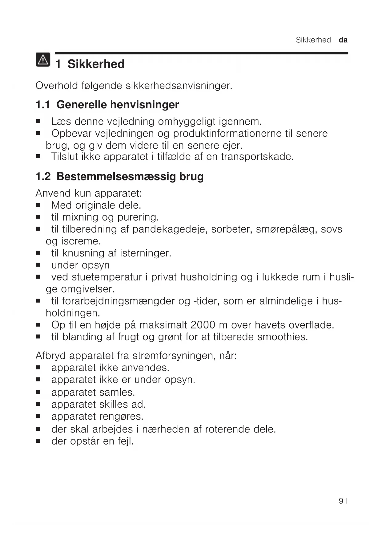 1 Sikkerhed Overhold følgende sikkerhedsanvisninger. 1.1 Generelle henvisninger ¡ Læs denne vejledning omhyggeligt igennem. ¡ Opbevar vejledningen og produktinformationerne til senere brug, og giv dem videre til en senere ejer. ¡ Tilslut ikke apparatet i tilfælde af en transportskade. 1.2 Bestemmelsesmæssig brug Anvend kun apparatet: ¡ Med originale dele. ¡ til mixning og purering. ¡ til tilberedning af pandekagedeje, sorbeter, smørepålæg, sovs og iscreme. ¡ til knusning af isterninger. ¡ under opsyn ¡ ved stuetemperatur i privat husholdning og i lukkede rum i husli- ge omgivelser. ¡ til forarbejdningsmængder og -tider, som er almindelige i hus- holdningen. ¡ Op til en højde på maksimalt 2000m over havets overflade. ¡ til blanding af frugt og grønt for at tilberede smoothies. Afbryd apparatet fra strømforsyningen, når: ¡ apparatet ikke anvendes. ¡ apparatet ikke er under opsyn. ¡ apparatet samles. ¡ apparatet skilles ad. ¡ apparatet rengøres. ¡ der skal arbejdes i nærheden af roterende dele. ¡ der opstår en fejl.da Sikkerhed