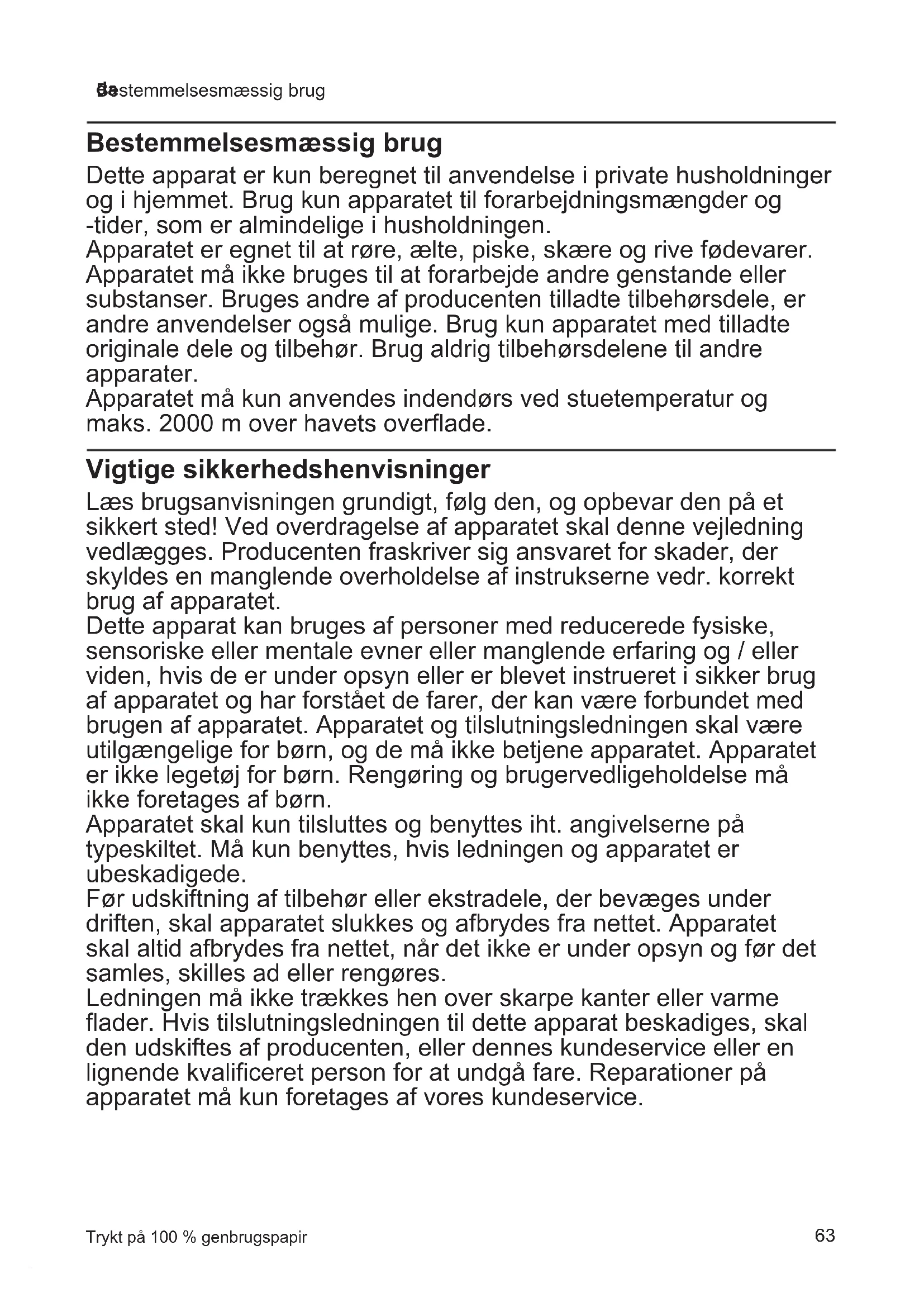 Bestemmelsesmæssig brug Dette apparat er kun beregnet til anvendelse i private husholdninger og i hjemmet. Brug kun apparatet til forarbejdningsmængder og -tider, som er almindelige i husholdningen. Apparatet er egnet til at røre, ælte, piske, skære og rive fødevarer. Apparatet må ikke bruges til at forarbejde andre genstande eller substanser. Bruges andre af producenten tilladte tilbehørsdele, er andre anvendelser også mulige. Brug kun apparatet med tilladte originale dele og tilbehør. Brug aldrig tilbehørsdelene til andre apparater. Apparatet må kun anvendes indendørs ved stuetemperatur og maks. 2000 m over havets overflade. Vigtige sikkerhedshenvisninger Læs brugsanvisningen grundigt, følg den, og opbevar den på et sikkert sted! Ved overdragelse af apparatet skal denne vejledning vedlægges. Producenten fraskriver sig ansvaret for skader, der skyldes en manglende overholdelse af instrukserne vedr. korrekt brug af apparatet. Dette apparat kan bruges af personer med reducerede fysiske, sensoriske eller mentale evner eller manglende erfaring og / eller viden, hvis de er under opsyn eller er blevet instrueret i sikker brug af apparatet og har forstået de farer, der kan være forbundet med brugen af apparatet. Apparatet og tilslutningsledningen skal være utilgængelige for børn, og de må ikke betjene apparatet. Apparatet er ikke legetøj for børn. Rengøring og brugervedligeholdelse må ikke foretages af børn. Apparatet skal kun tilsluttes og benyttes iht. angivelserne på typeskiltet. Må kun benyttes, hvis ledningen og apparatet er ubeskadigede. Før udskiftning af tilbehør eller ekstradele, der bevæges under driften, skal apparatet slukkes og afbrydes fra nettet. Apparatet skal altid afbrydes fra nettet, når det ikke er under opsyn og før det samles, skilles ad eller rengøres. Ledningen må ikke trækkes hen over skarpe kanter eller varme flader. Hvis tilslutningsledningen til dette apparat beskadiges, skal den udskiftes af producenten, eller dennes kundeservice eller en lignende kvalificeret person for at undgå fare. Reparationer på apparatet må kun foretages af vores kundeservice. Trykt på 100 % genbrugspapir Bestemmelsesmæssig brug64
