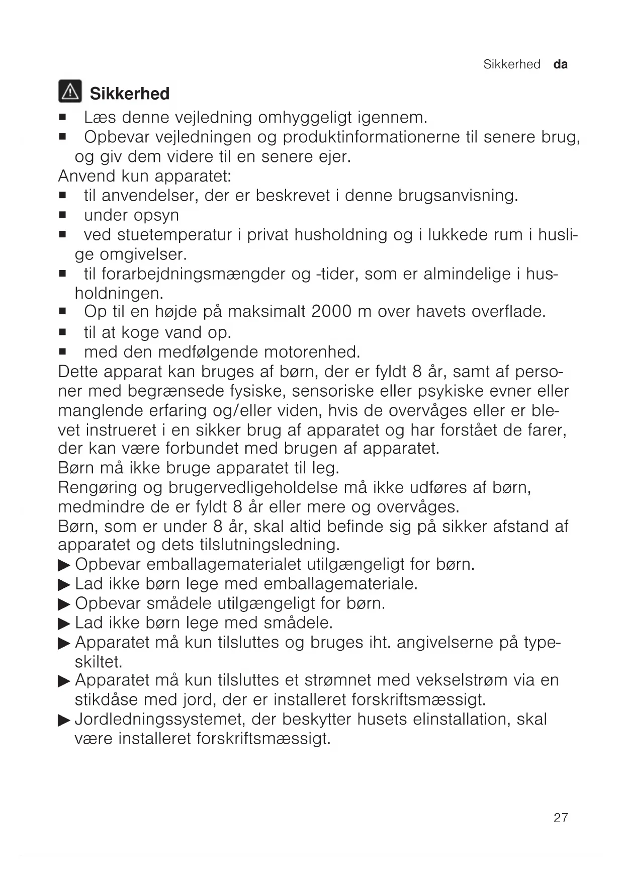 Sikkerhed ¡ Læs denne vejledning omhyggeligt igennem. ¡ Opbevar vejledningen og produktinformationerne til senere brug, og giv dem videre til en senere ejer. Anvend kun apparatet: ¡ til anvendelser, der er beskrevet i denne brugsanvisning. ¡ under opsyn ¡ ved stuetemperatur i privat husholdning og i lukkede rum i husli- ge omgivelser. ¡ til forarbejdningsmængder og -tider, som er almindelige i hus- holdningen. ¡ Op til en højde på maksimalt 2000m over havets overflade. ¡ til at koge vand op. ¡ med den medfølgende motorenhed. Dette apparat kan bruges af børn, der er fyldt 8 år, samt af perso- ner med begrænsede fysiske, sensoriske eller psykiske evner eller manglende erfaring og/eller viden, hvis de overvåges eller er ble- vet instrueret i en sikker brug af apparatet og har forstået de farer, der kan være forbundet med brugen af apparatet. Børn må ikke bruge apparatet til leg. Rengøring og brugervedligeholdelse må ikke udføres af børn, medmindre de er fyldt 8 år eller mere og overvåges. Børn, som er under 8 år, skal altid befinde sig på sikker afstand af apparatet og dets tilslutningsledning. ▶ Opbevar emballagematerialet utilgængeligt for børn. ▶ Lad ikke børn lege med emballagemateriale. ▶ Opbevar smådele utilgængeligt for børn. ▶ Lad ikke børn lege med smådele. ▶ Apparatet må kun tilsluttes og bruges iht. angivelserne på type- skiltet. ▶ Apparatet må kun tilsluttes et strømnet med vekselstrøm via en stikdåse med jord, der er installeret forskriftsmæssigt. ▶ Jordledningssystemet, der beskytter husets elinstallation, skal være installeret forskriftsmæssigt.da Sikkerhed