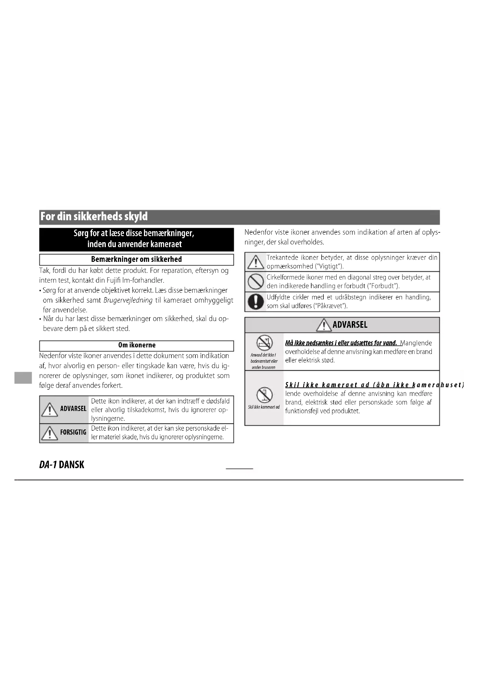 - Når du har læst disse bemærkninger om sikkerhed, skal du op- bevare dem på et sikkert sted. Om ikonerne Nedenfor viste ikoner anvendes i dette dokument som indikation af, hvor alvorlig en person- eller tingskade kan være, hvis du ig- norerer de oplysninger, som ikonet indikerer, og produktet som følge deraf anvendes forkert. ADVARSELDette ikon indikerer, at der kan indtræff e dødsfald eller alvorlig tilskadekomst, hvis du ignorerer op-lysningerne.FORSIGTIGDette ikon indikerer, at der kan ske personskade el-ler materiel skade, hvis du ignorerer oplysningerne. Nedenfor viste ikoner anvendes som indikation af arten af oplys- ninger, der skal overholdes. Trekantede ikoner betyder, at disse oplysninger kræver din opmærksomhed (”Vigtigt”).Cirkelformede ikoner med en diagonal streg over betyder, at den indikerede handling er forbudt (”Forbudt”).Udfyldte cirkler med et udråbstegn indikerer en handling, som skal udføres (“Påkrævet”). ADVARSEL ADVARSEL Anvend det ikke i badeværelset eller under bruserenMå ikke nedsænkes i eller udsættes for vand. Manglende overholdelse af denne anvisning kan medføre en brand eller elektrisk stød.Skil ikke kameraet adSkil ikke kameraet ad (åbn ikke kamerahuset). Mang-lende overholdelse af denne anvisning kan medføre brand, elektrisk stød eller personskade som følge af funktionsfejl ved produktet.DA-2DANSK ADVARSEL ADVARSEL Rør ikke ved de indvendige dele Hvis kameraet går i stykker som følge af, at du taber det, eller der sker et andet uheld, må du ikke røre ved de dele, der kommer til syne. Manglende overholdelse af denne anvisning kan medføre elektrisk stød eller personskade ved berøring af de beskadigede dele. Tag øjeblikkeligt kameraets batteri ud - pas på, at du ikke kommer til skade eller får elektrisk stød - og indlevér produktet til eftersyn på købsstedet. Må ikke anbringes på ustabile over ader. Produktet kan falde ned og medføre tilskadekomst. Se ikke på solen gennem objektivets eller kameraets søger. Manglende overholdelse af denne anvisning kan med- føre permanent skade på synet. FORSIGTIG FORSIGTIG Må ikke anvendes eller opbevares på steder med damp el- ler røg, eller som er meget fugtige eller ekstremt støvede. Manglende overholdelse af denne anvisning kan med- føre brand eller elektrisk stød. Må ikke efterlades i direkte sollys eller på steder med me- get høje temperaturer, såsom i et lukket køretøj på en solrig dag. Manglende overholdelse af denne anvisning kan medføre brand. FORSIGTIG FORSIGTIG Opbevar kameraet utilgængeligt for små børn. Dette pro- dukt kan medføre personskade, når det er i hænderne på børn. Må ikke håndteres med våde hænder. Manglende over- holdelse af denne anvisning kan medføre elektrisk stød. Hold sollyset væk fra billedet, når du tager billeder af mo- tiver i modlys. Hvis sollyset fokuseres i kameraet, når solen er i eller tæt på billedet kan medføre brand eller forbrændinger. Når produktet ikke anvendes, skal du sætte objektivdæks- le rne på igen og opbevare det på et sted ud en direkte sol lys. Sollys fokuseret af objektivet kan medføre brand eller forbrændinger. Bær ikke kameraet eller objektivet, mens de er monteret på et stativ. Produktet kan falde ned eller ramme andre genstande og medføre tilskadekomst.DA-3 DANSK Bortska else af elektrisk og elektronisk udstyr i private husholdninger Bortska else af elektrisk og elektronisk udstyr i private husholdninger I EU, Norge, Island og Liechtenstein: Dette symbol på produktet eller i brugervejledningen og i garantien og/eller på emballagen bety- der, at dette produkt ikke bør behandles som husholdningsaff ald. Det bør i stedet afl everes på et egnet indsamlingssted for genbrug af elektrisk og elektronisk udstyr. Når du sikrer en korrekt bortskaff else af dette produkt, bidrager du til at fore- bygge potentielle negative konsekvenser for miljø og folkesundhed, som ellers vil kunne opstå ved uhensigtsmæssig aff aldshåndtering af dette produkt. Genbrug af materialet bidrager til at bevare naturens ressourcer. For mere detaljerede oplysninger om genbrug af dette produkt, bedes du kontakte de lokale myndigheder, dit lokale renovationsfi rma eller den forretning, hvor du har købt produktet. I lande uden for EU, Norge, Island og Liechtenstein: Hvis du ønsker at kassere dette produkt, herunder batterier eller akkumulatorer, bedes du kontakte de lokale myndigheder og få anvist den korrekte bortskaff elsesprocedure.DA-4DANSK Før anvendelse af dette produkt Objektivet fungerer muligvis ikke som ventet, og visse funktioner er måske ikke tilgængelige med ældre versioner af kameraets rmware. Sørg for at opdatere kameraets rmware til den nyeste version. Du kan nde instruktioner i visning af kameraets rmwareversion samt opdatering af kameraets rmware på følgende hjemmeside: http://www.fujifilm.com/support/digital_cameras/ software/#firmware Hvis du ikke har adgang til en computer, kan du få support hos den lokale forhandler opstil- let i materialet ”FUJIFILM Worldwide Network”, der følger med dit kamera. Produktvedligeholdelse