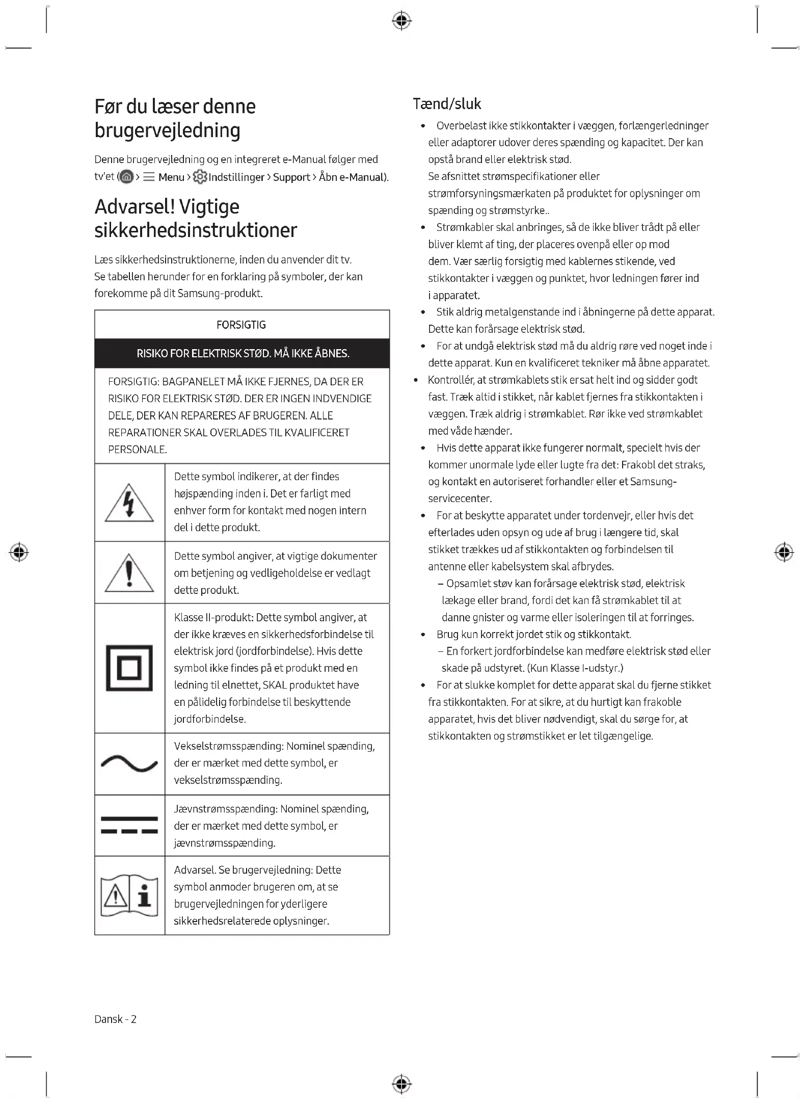 PERSONALE. Dette symbol indikerer, at der findes højspænding inden i. Det er farligt med enhver form for kontakt med nogen intern del i dette produkt. Dette symbol angiver, at vigtige dokumenter om betjening og vedligeholdelse er vedlagt dette produkt. Klasse II-produkt: Dette symbol angiver, at der ikke kræves en sikkerhedsforbindelse til elektrisk jord (jordforbindelse). Hvis dette symbol ikke findes på et produkt med en ledning til elnettet, SKAL produktet have en pålidelig forbindelse til beskyttende jordforbindelse. Vekselstrømsspænding: Nominel spænding, der er mærket med dette symbol, er vekselstrømsspænding. Jævnstrømsspænding: Nominel spænding, der er mærket med dette symbol, er jævnstrømsspænding. Advarsel. Se brugervejledning: Dette symbol anmoder brugeren om, at se brugervejledningen for yderligere sikkerhedsrelaterede oplysninger. Tænd/sluk