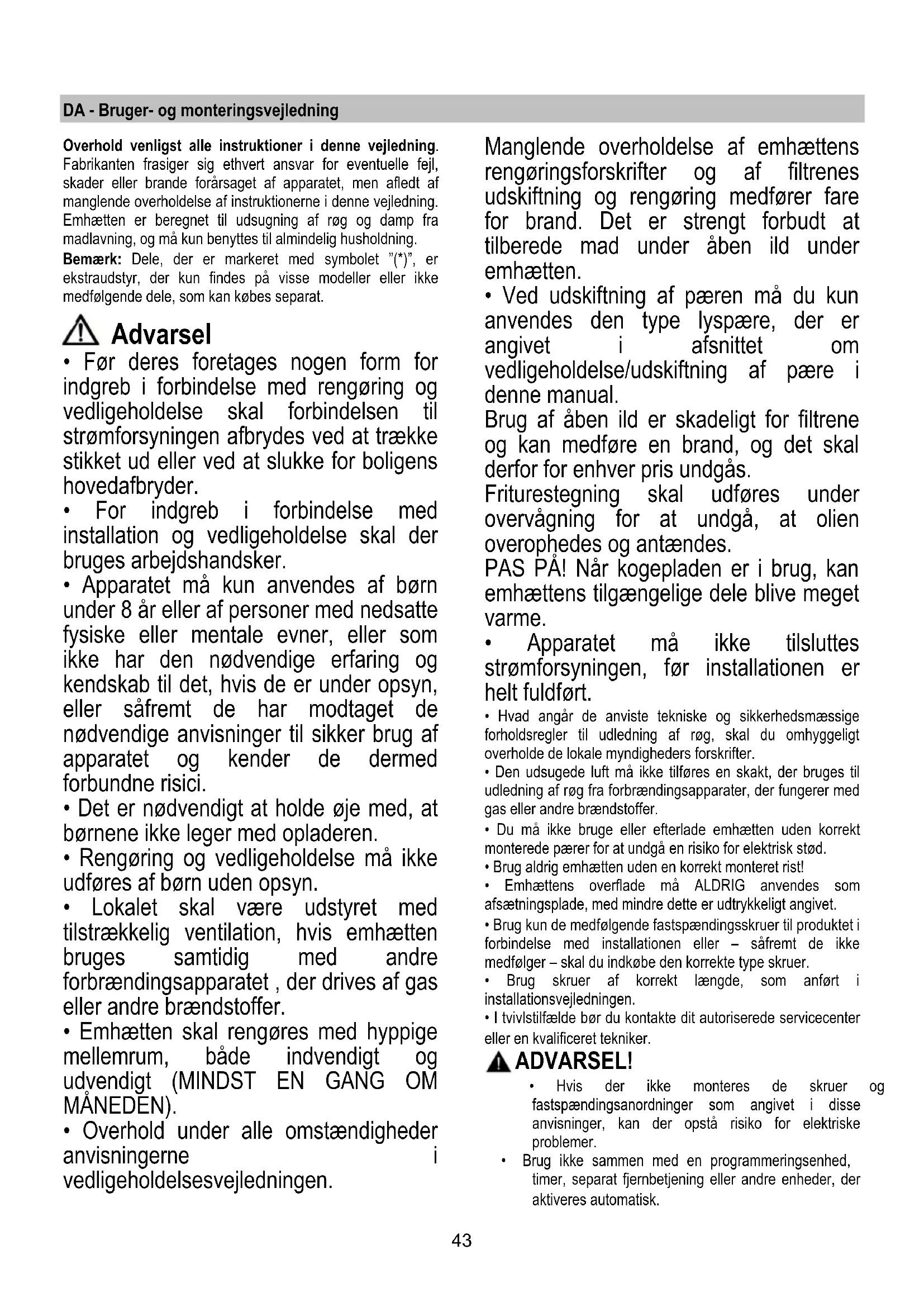 - Overhold under alle omstændigheder anvisningerne i vedligeholdelsesvejledningen. Manglende overholdelse af emhættens rengøringsforskrifter og af filtrenes udskiftning og rengøring medfører fare for brand. Det er strengt forbudt at tilberede mad under åben ild under emhætten.