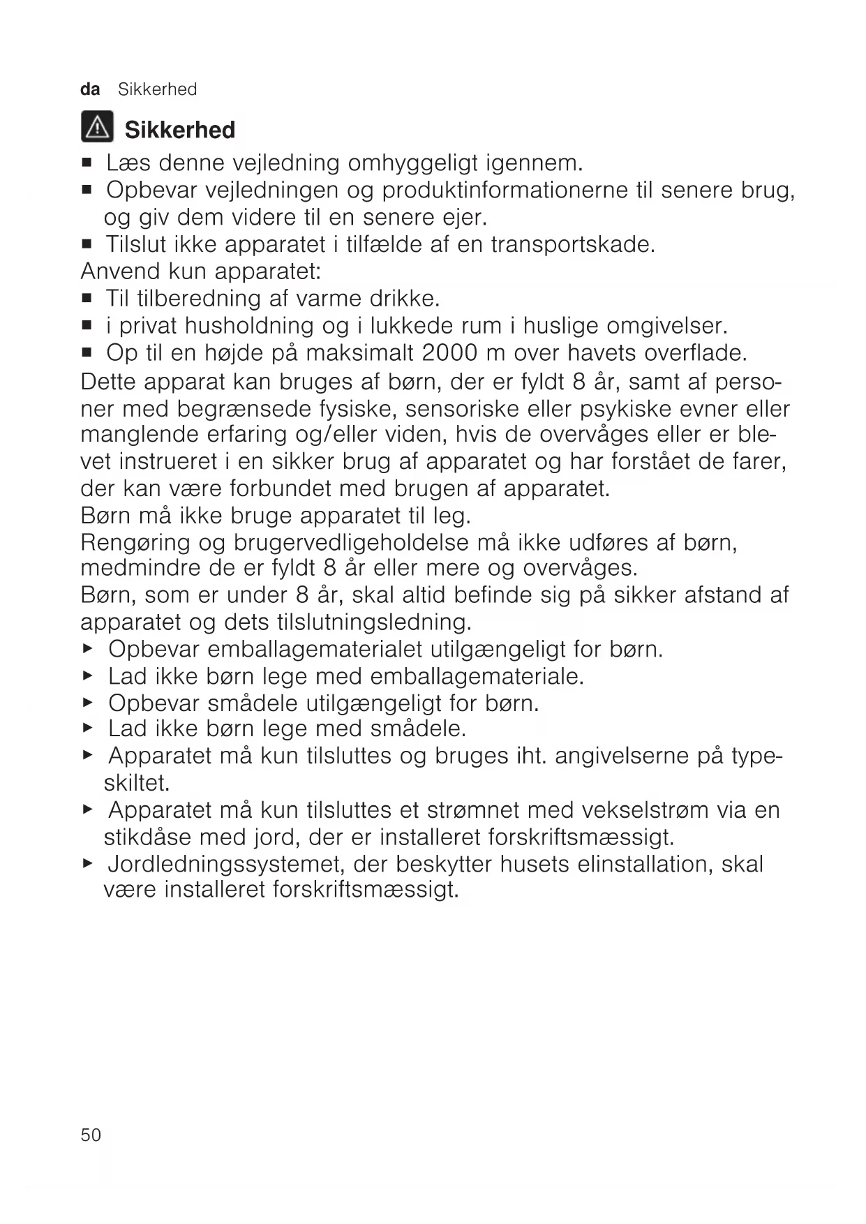 Sikkerhed ¡ Læs denne vejledning omhyggeligt igennem. ¡ Opbevar vejledningen og produktinformationerne til senere brug, og giv dem videre til en senere ejer. ¡ Tilslut ikke apparatet i tilfælde af en transportskade. Anvend kun apparatet: ¡ Til tilberedning af varme drikke. ¡ i privat husholdning og i lukkede rum i huslige omgivelser. ¡ Op til en højde på maksimalt 2000m over havets overflade. Dette apparat kan bruges af børn, der er fyldt 8 år, samt af perso- ner med begrænsede fysiske, sensoriske eller psykiske evner eller manglende erfaring og/eller viden, hvis de overvåges eller er ble- vet instrueret i en sikker brug af apparatet og har forstået de farer, der kan være forbundet med brugen af apparatet. Børn må ikke bruge apparatet til leg. Rengøring og brugervedligeholdelse må ikke udføres af børn, medmindre de er fyldt 8 år eller mere og overvåges. Børn, som er under 8 år, skal altid befinde sig på sikker afstand af apparatet og dets tilslutningsledning. ▶ Opbevar emballagematerialet utilgængeligt for børn. ▶ Lad ikke børn lege med emballagemateriale. ▶ Opbevar smådele utilgængeligt for børn. ▶ Lad ikke børn lege med smådele. ▶ Apparatet må kun tilsluttes og bruges iht. angivelserne på type- skiltet. ▶ Apparatet må kun tilsluttes et strømnet med vekselstrøm via en stikdåse med jord, der er installeret forskriftsmæssigt. ▶ Jordledningssystemet, der beskytter husets elinstallation, skal være installeret forskriftsmæssigt.Sikkerhed da Trykt på 100 % genbrugspapir 51 ▶ I Danmark er apparatet kun godkendt til brug i forbindelse med en stikkontakt type E. ▶ Hvis der kun findes en stikkontakt af type K på tilslutningsstedet, skal apparatet tilsluttes med en egnet adapter. Kun på den måde er apparatet jordet korrekt. Denne adapter (reservedels-nr. 00623333) kan købes hos kundeservice. ▶ Brug aldrig et beskadiget apparat. ▶ Brug aldrig et apparat med revnet eller ødelagt overflade. ▶ Træk aldrig i nettilslutningsledningen for at afbryde apparatets forbindelse til strømnettet. Tag altid fat i nettilslutningsledningens netstik, og træk det ud. ▶ Hvis apparatet eller nettilslutningsledningen er beskadiget, så træk straks nettilslutningsledningens netstik ud, eller slå sikrin- gen fra i sikringsskabet. ▶ Kontakt kundeservice. ▶ Kun fagpersonale, der er uddannet til det, må udføre reparatio- ner på apparatet. ▶ Der må kun anvendes originale reservedele til reparation af ap- paratet. ▶ Hvis nettilslutningsledningen til apparatet bliver beskadiget, skal den udskiftes af producenten, producentens kundeservice eller en lignende kvalificeret person for at undgå, at der opstår fare. ▶ Dyp aldrig apparatet eller nettilslutningsledningen i vand. ▶ Der må ikke løbe væske over på apparatets stikforbindelse.da Oversigt 52 Trykt på 100 % genbrugspapir ▶ Anvend kun apparatet i lukkede rum. ▶ Udsæt aldrig apparatet for ekstrem varme og fugt. ▶ Brug ikke damprenser eller højtryksrenser til at rengøre appara- tet. ▶ Sørg for tilstrækkelig ventilation af maskinen. ▶ Brug aldrig maskinen i et skab. ▶ Hold altid øje med apparatet, når det er i brug. ▶ Brug ikke forlængerledning eller multistikdåser. ▶ Hvis nettilslutningsledningen er for kort, så kontakt kundeservice. ▶ Brug kun adaptere godkendt af producenten. ▶ Åbn aldrig bryggesystemet under brug. ▶ Brug kun de originale Tassimo TDISC'e. ▶ Brug aldrig en beskadiget T DISC. ▶ Brug aldrig en drik-T DISC flere gange. ▶ Berør aldrig de varme apparatdele. ▶ Lad de varme apparatdele køle af efter brug, før de berøres. ▶ Lad om nødvendigt drikkene køle af. ▶ Undgå hudkontakt med væsker og dampe, der kommer ud. ▶ Anvend kun apparatet i overensstemmelse med dets bestem- melsesmæssige brug for at undgå skader. ▶ Pas på fingrene ved håndtering og rengøring af T DISC. ▶ Personer med elektroniske implantater skal overholde en mini- mumsafstand på 10cm til apparatet. ▶ Overhold også minimumsafstanden på 10 cm til vandbehol- deren, der er taget af. ▶ Følg anvisningerne om hygiejne med hensyn til apparatet. Oversigt Her kan du finde en oversigt over appara- tets bestanddele. Bemærk:Alt efter apparatets type kan der være afvigelser i farve og andre detaljer.