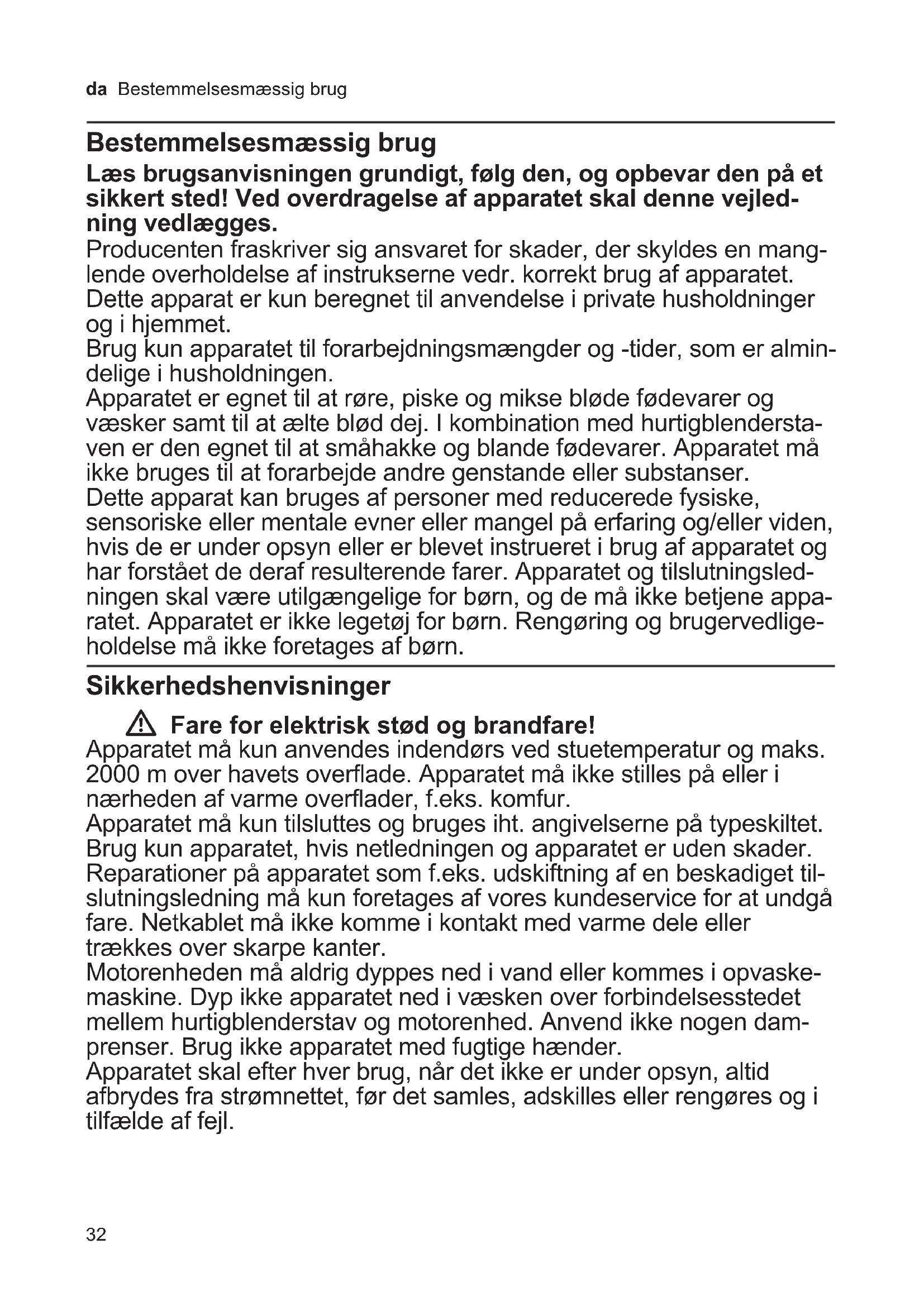 Gooi verpakkingsmateriaal op een milieuvriendelijke manier weg. Dit apparaat is gekenmerkt in overeen- stemming met de Europese richtlijn 2012/19/EU betreffende afgedankte elektrische en elektronische appara- tuur (waste electrical and electronic equipment – WEEE). De richtlijn geeft het kader aan voor de in de EU geldige terugneming en verwerking van oude apparaten. Raadpleeg uw gespecialiseerde handelaar voor de geldende voorschriften inzake afvalverwijdering. Garantie Voor dit apparaat gelden de garantievoor- waarden die worden uitgegeven door de vertegenwoordiging van ons bedrijf in het land van aankoop. De leverancier, bij wie u het apparaat heeft gekocht, geeft u hierover graag meer informatie. Om aanspraak te maken op de garantie heeft u altijd uw aankoopbewijs nodig. Wijzigingen voorbehouden.32 da Bestemmelsesmæssig brug Bestemmelsesmæssig brug Læs brugsanvisningen grundigt, følg den, og opbevar den på et sikkert sted! Ved overdragelse af apparatet skal denne vejled- ning vedlægges. Producenten fraskriver sig ansvaret for skader, der skyldes en mang- lende overholdelse af instrukserne vedr. korrekt brug af apparatet. Dette apparat er kun beregnet til anvendelse i private husholdninger og i hjemmet. Brug kun apparatet til forarbejdningsmængder og -tider, som er almin- delige i husholdningen. Apparatet er egnet til at røre, piske og mikse bløde fødevarer og væsker samt til at ælte blød dej. I kombination med hurtigblendersta- ven er den egnet til at småhakke og blande fødevarer. Apparatet må ikke bruges til at forarbejde andre genstande eller substanser. Dette apparat kan bruges af personer med reducerede fysiske, sensoriske eller mentale evner eller mangel på erfaring og/eller viden, hvis de er under opsyn eller er blevet instrueret i brug af apparatet og har forstået de deraf resulterende farer. Apparatet og tilslutningsled- ningen skal være utilgængelige for børn, og de må ikke betjene appa- ratet. Apparatet er ikke legetøj for børn. Rengøring og brugervedlige- holdelse må ikke foretages af børn. Sikkerhedshenvisninger W Fare for elektrisk stød og brandfare! Apparatet må kun anvendes indendørs ved stuetemperatur og maks. 2000 m over havets overflade. Apparatet må ikke stilles på eller i nærheden af varme overflader, f.eks. komfur. Apparatet må kun tilsluttes og bruges iht. angivelserne på typeskiltet. Brug kun apparatet, hvis netledningen og apparatet er uden skader. Reparationer på apparatet som f.eks. udskiftning af en beskadiget til- slutningsledning må kun foretages af vores kundeservice for at undgå fare. Netkablet må ikke komme i kontakt med varme dele eller trækkes over skarpe kanter. Motorenheden må aldrig dyppes ned i vand eller kommes i opvaske- maskine. Dyp ikke apparatet ned i væsken over forbindelsesstedet mellem hurtigblenderstav og motorenhed. Anvend ikke nogen dam- prenser. Brug ikke apparatet med fugtige hænder. Apparatet skal efter hver brug, når det ikke er under opsyn, altid afbrydes fra strømnettet, før det samles, adskilles eller rengøres og i tilfælde af fejl.33
