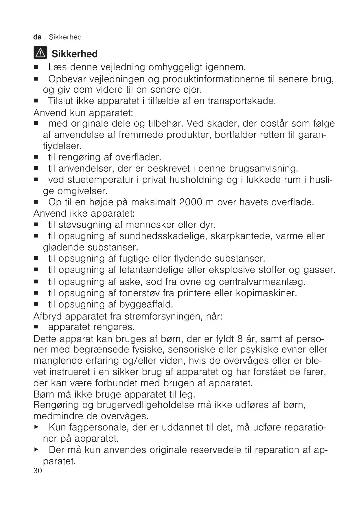 Sikkerhed ¡ Læs denne vejledning omhyggeligt igennem. ¡ Opbevar vejledningen og produktinformationerne til senere brug, og giv dem videre til en senere ejer. ¡ Tilslut ikke apparatet i tilfælde af en transportskade. Anvend kun apparatet: ¡ med originale dele og tilbehør. Ved skader, der opstår som følge af anvendelse af fremmede produkter, bortfalder retten til garan- tiydelser. ¡ til rengøring af overflader. ¡ til anvendelser, der er beskrevet i denne brugsanvisning. ¡ ved stuetemperatur i privat husholdning og i lukkede rum i husli- ge omgivelser. ¡ Op til en højde på maksimalt 2000m over havets overflade. Anvend ikke apparatet: ¡ til støvsugning af mennesker eller dyr. ¡ til opsugning af sundhedsskadelige, skarpkantede, varme eller glødende substanser. ¡ til opsugning af fugtige eller flydende substanser. ¡ til opsugning af letantændelige eller eksplosive stoffer og gasser. ¡ til opsugning af aske, sod fra ovne og centralvarmeanlæg. ¡ til opsugning af tonerstøv fra printere eller kopimaskiner. ¡ til opsugning af byggeaffald. Afbryd apparatet fra strømforsyningen, når: ¡ apparatet rengøres. Dette apparat kan bruges af børn, der er fyldt 8 år, samt af perso- ner med begrænsede fysiske, sensoriske eller psykiske evner eller manglende erfaring og/eller viden, hvis de overvåges eller er ble- vet instrueret i en sikker brug af apparatet og har forstået de farer, der kan være forbundet med brugen af apparatet. Børn må ikke bruge apparatet til leg. Rengøring og brugervedligeholdelse må ikke udføres af børn, medmindre de overvåges. ▶ Kun fagpersonale, der er uddannet til det, må udføre reparatio- ner på apparatet. ▶ Der må kun anvendes originale reservedele til reparation af ap- paratet.Sikkerhed da