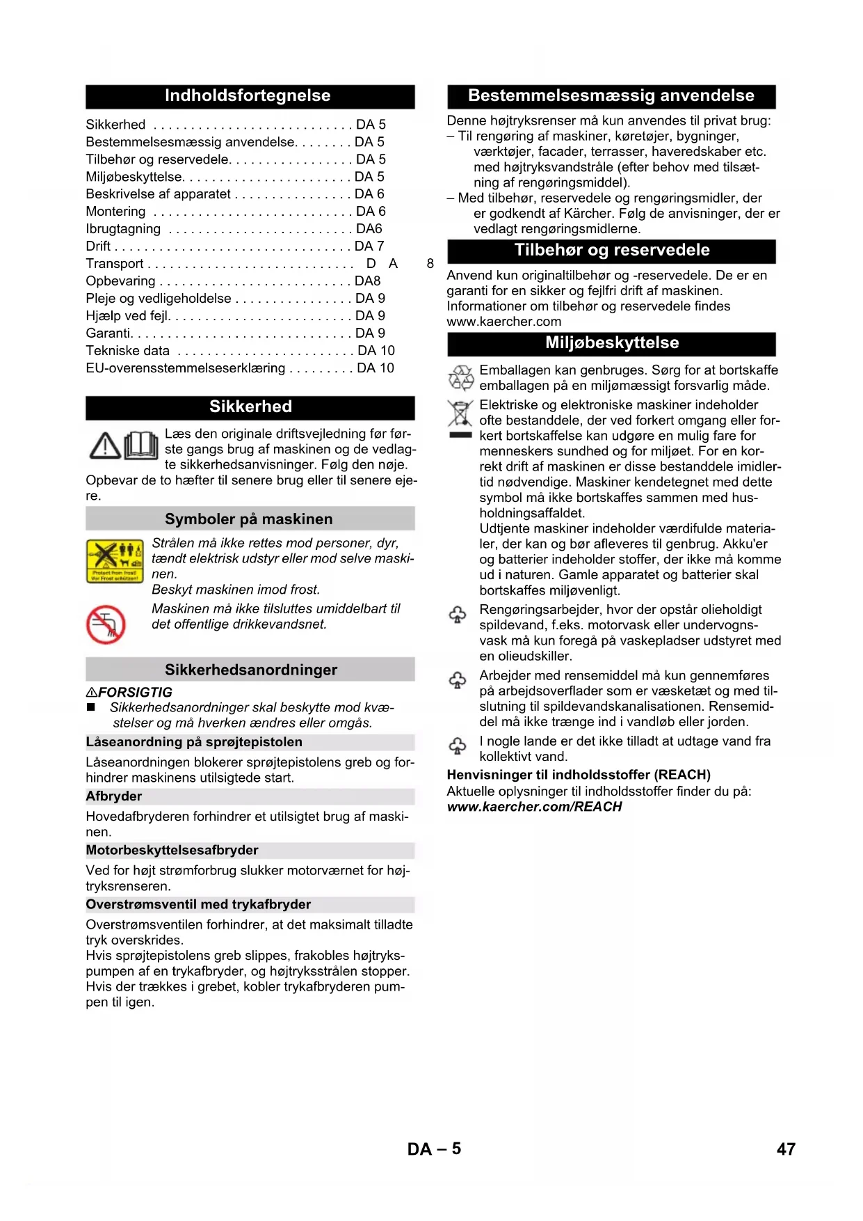 95 dB(A) Motivo da excepção de acordo com o Regulamento (UE) 2019/1781 Anexo I, Parte 2, n.º 12: j) O fabricante reserva-se o direito de proceder a quaisquer altera- ções técnicas. Declaração UE de conformidade Produto: Lavadora de alta pressão Tipo: K 6 Special Respectivas Directrizes da UE 2006/42/CE (+2009/127/CE) 2014/30/UE 2011/65/UE 2000/14/CE 2009/125/CE Disposições aplicadas (UE) 2019/1781 Normas harmonizadas aplicadas EN 60335–1 EN 60335–2–79 EN 62233: 2008 EN 55014–1: 2017 + A11: 2020 EN 55014–2: 2015 EN 61000–3–2: 2014 EN 61000–3–11: 2000 EN IEC 63000: 2018 Processo aplicado de avaliação de conformidade 2000/14/CE: Anexo V Nível de potência acústica dB(A) Medido: 92 Garantido: 95 Winnenden, 2021/06/01 Chairman of the Board of Management Director Regulatory Affairs & Certification 46 PT– 5 Læs den originale driftsvejledning før før- ste gangs brug af maskinen og de vedlag- te sikkerhedsanvisninger. Følg den nøje. Opbevar de to hæfter til senere brug eller til senere eje- re. 몇 FORSIGTIG Sikkerhedsanordninger skal beskytte mod kvæ- stelser og må hverken ændres eller omgås. Låseanordningen blokerer sprøjtepistolens greb og for- hindrer maskinens utilsigtede start. Hovedafbryderen forhindrer et utilsigtet brug af maski- nen. Ved for højt strømforbrug slukker motorværnet for høj- tryksrenseren. Overstrømsventilen forhindrer, at det maksimalt tilladte tryk overskrides. Hvis sprøjtepistolens greb slippes, frakobles højtryks- pumpen af en trykafbryder, og højtryksstrålen stopper. Hvis der trækkes i grebet, kobler trykafbryderen pum- pen til igen. Denne højtryksrenser må kun anvendes til privat brug: – Til rengøring af maskiner, køretøjer, bygninger, værktøjer, facader, terrasser, haveredskaber etc. med højtryksvandstråle (efter behov med tilsæt- ning af rengøringsmiddel). – Med tilbehør, reservedele og rengøringsmidler, der er godkendt af Kärcher. Følg de anvisninger, der er vedlagt rengøringsmidlerne. Anvend kun originaltilbehør og -reservedele. De er en garanti for en sikker og fejlfri drift af maskinen. Informationer om tilbehør og reservedele findes www.kaercher.com Henvisninger til indholdsstoffer (REACH) Aktuelle oplysninger til indholdsstoffer finder du på: www.kaercher.com/REACH Indholdsfortegnelse Sikkerhed . . . . . . . . . . . . . . . . . . . . . . . . . . . DA 5 Bestemmelsesmæssig anvendelse. . . . . . . . DA 5 Tilbehør og reservedele. . . . . . . . . . . . . . . . . DA 5 Miljøbeskyttelse. . . . . . . . . . . . . . . . . . . . . . . DA 5 Beskrivelse af apparatet . . . . . . . . . . . . . . . . DA 6 Montering . . . . . . . . . . . . . . . . . . . . . . . . . . . DA 6 Ibrugtagning . . . . . . . . . . . . . . . . . . . . . . . . . DA6 Drift . . . . . . . . . . . . . . . . . . . . . . . . . . . . . . . . DA 7 Transport . . . . . . . . . . . . . . . . . . . . . . . . . . . .DA 8 Opbevaring . . . . . . . . . . . . . . . . . . . . . . . . . . DA8 Pleje og vedligeholdelse . . . . . . . . . . . . . . . . DA 9 Hjælp ved fejl. . . . . . . . . . . . . . . . . . . . . . . . . DA 9 Garanti. . . . . . . . . . . . . . . . . . . . . . . . . . . . . . DA 9 Tekniske data . . . . . . . . . . . . . . . . . . . . . . . . DA 10 EU-overensstemmelseserklæring . . . . . . . . . DA 10 Sikkerhed Symboler på maskinen Strålen må ikke rettes mod personer, dyr, tændt elektrisk udstyr eller mod selve maski- nen. Beskyt maskinen imod frost. Maskinen må ikke tilsluttes umiddelbart til det offentlige drikkevandsnet. Sikkerhedsanordninger Låseanordning på sprøjtepistolen Afbryder Motorbeskyttelsesafbryder Overstrømsventil med trykafbryder Bestemmelsesmæssig anvendelse Tilbehør og reservedele Miljøbeskyttelse Emballagen kan genbruges. Sørg for at bortskaffe emballagen på en miljømæssigt forsvarlig måde. Elektriske og elektroniske maskiner indeholder ofte bestanddele, der ved forkert omgang eller for- kert bortskaffelse kan udgøre en mulig fare for menneskers sundhed og for miljøet. For en kor- rekt drift af maskinen er disse bestanddele imidler- tid nødvendige. Maskiner kendetegnet med dette symbol må ikke bortskaffes sammen med hus- holdningsaffaldet. Udtjente maskiner indeholder værdifulde materia- ler, der kan og bør afleveres til genbrug. Akku'er og batterier indeholder stoffer, der ikke må komme ud i naturen. Gamle apparatet og batterier skal bortskaffes miljøvenligt. Rengøringsarbejder, hvor der opstår olieholdigt spildevand, f.eks. motorvask eller undervogns- vask må kun foregå på vaskepladser udstyret med en olieudskiller. Arbejder med rensemiddel må kun gennemføres på arbejdsoverflader som er væsketæt og med til- slutning til spildevandskanalisationen. Rensemid- del må ikke trænge ind i vandløb eller jorden. I nogle lande er det ikke tilladt at udtage vand fra kollektivt vand. 47DA– 6 Maskinen, tilbehør m.m. vises på emballagen. Kontrol- ler ved udpakningen, om indholdet er komplet. Kontakt venligst forhandleren, hvis der mangler tilbehør eller ved transportskader. Se figurerne på side 2 1 Vandtilslutning med integreret si 2 Tilkoblingsdel til vandforsyning 3 Lynkobling til højtryksslangen 4 Opbevaring til højtrykpistol 5 Hovedafbryder „0/OFF“ / „I/ON“ 6 Doseringsregulering til rensemiddel 7 Opbevaring til højtrykpistol 8 Transportgreb 9 Plug 'n' Clean rensemiddeldunk med dæksel 10 Opbevaring Plug 'n' Clean rensemiddeldunk med tilslutning for rensemiddel 11 Opbevaring til højtryksslangen 12 Opbevaring til strålerøret 13 Opbevaringskrog til strømledningen 14 Strømledning med netstik 15 Tranporthjul 16 Højtrykpistol 17 Låseanordning på sprøjtepistolen 18 Knap til at adskille højtrykslangen fra sprøjtepisto- len 19 Højtryksslange 20 Strålerør med rotordyse Til svære tilsmudsinger 21 Strålerør med trykregulering (Vario Power) Til de mest almindelige rengøringsopgaver Arbejdstrykket kan øges trinløst fra "SOFT" til "HARD". Giv slip på højtryks