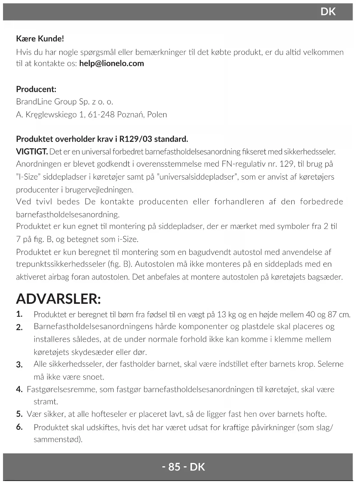 Kære Kunde! Hvis du har nogle spørgsmål eller bemærkninger l det købte produkt, er du ald velkommen l at kontakte os: help@lionelo.com Producent: BrandLine Group Sp. z o. o. A. Kręglewskiego 1, 61-248 Poznań, Polen Produktet overholder krav i R129/03 standard. VIGTIGT. Det er en universal forbedret barnefastholdelsesanordning kseret med sikkerhedsseler. Anordningen er blevet godkendt i overensstemmelse med FN-regulav nr. 129, l brug på ”I-Size” siddepladser i køretøjer samt på ”universalsiddepladser”, som er anvist af køretøjers producenter i brugervejledningen. Ved tvivl bedes De kontakte producenten eller forhandleren af den forbedrede barnefastholdelsesanordning. Produktet er kun egnet l montering på siddepladser, der er mærket med symboler fra 2 l 7 på g. B, og betegnet som i-Size. Produktet er kun beregnet l montering som en bagudvendt autostol med anvendelse af trepunktssikkerhedsseler (g. B). Autostolen må ikke monteres på en siddeplads med en akveret airbag foran autostolen. Det anbefales at montere autostolen på køretøjets bagsæder. ADVARSLER: