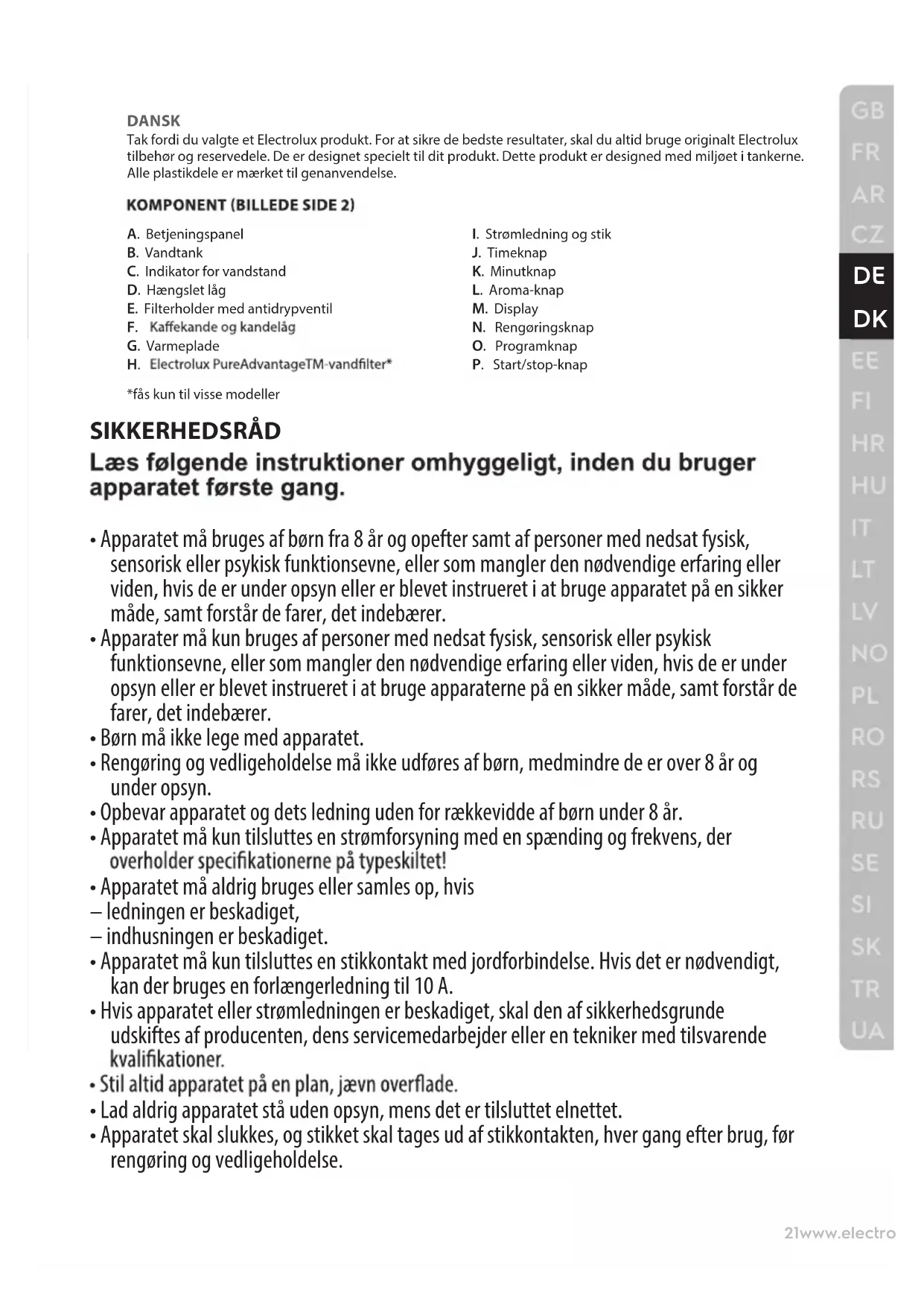 Genbrug materialer med symbolet . Anbring emballagematerialet i passende beholdere til genbrug. Hjælp med at beskytte miljøet og menneskelig sundhed samt at genbruge aald af elektriske og elektroniske apparater. Kasser ikke apparater, der er mærket med symbolet , sammen med husholdningsaaldet. Lever produktet tilbage til din lokale genbrugsplads eller kontakt din kommune. MILJØHENSYNEESTI Täname teid Electroluxi toote valimise eest. Parimate tulemuste tagamiseks kasutage alati ehtsaid Electroluxi tarvikuid ja varuosi. Need on loodud spetsiaalselt teie toote jaoks. Selle toote loomisel on arvestatud keskkonnaga. Kõik plastosad on ümbertöötlemise jaoks märgistatud. A. Juhtpaneel B. Veepaak C. Veetaseme indikaator D. Hingedega kaas