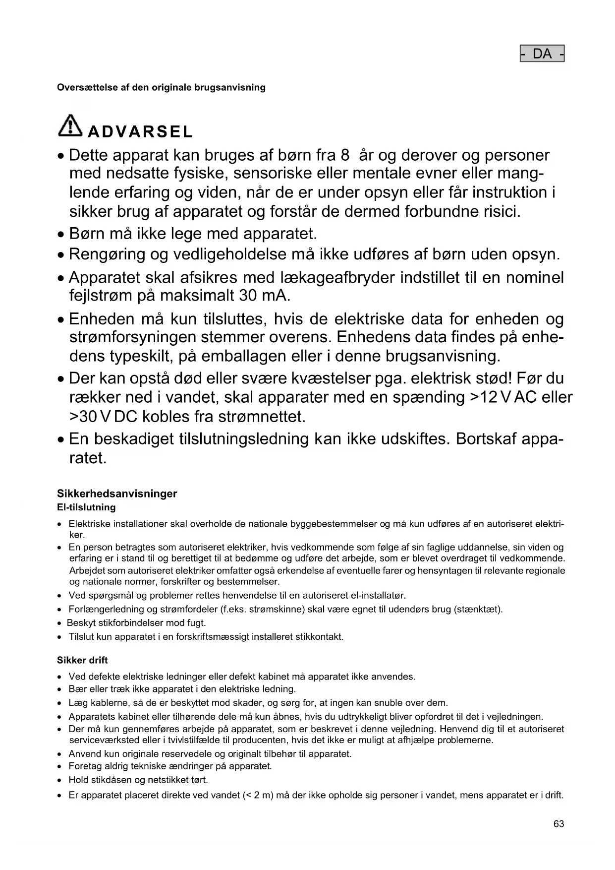 - Er apparatet placeret direkte ved vandet (< 2 m) må der ikke opholde sig personer i vandet, mens apparatet er i drift.- DA -