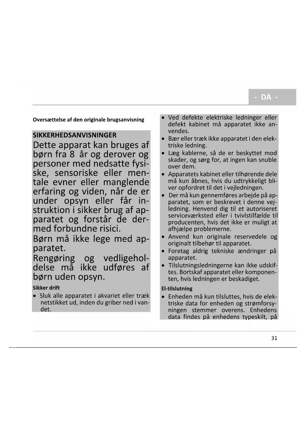 - DA - Oversættelse af den originale brugsanvisning SIKKERHEDSANVISNINGER Dette apparat kan bruges af børn fra 8 år og derover og personer med nedsatte fysi- ske, sensoriske eller men- tale evner eller manglende erfaring og viden, når de er under opsyn eller får in- struktion i sikker brug af ap- paratet og forstår de der- med forbundne risici. Børn må ikke lege med ap- paratet. Rengøring og vedligehol- delse må ikke udføres af børn uden opsyn. Sikker drift