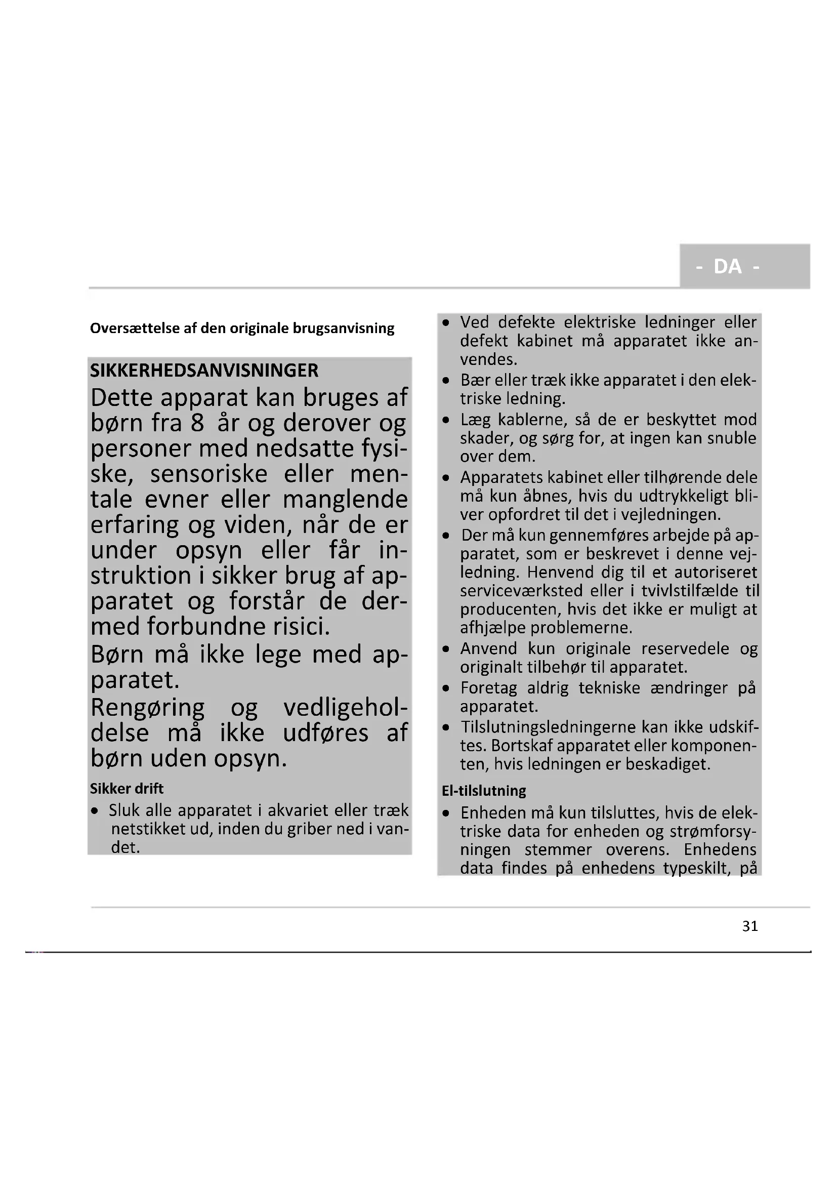 - DA - Oversættelse af den originale brugsanvisning SIKKERHEDSANVISNINGER Dette apparat kan bruges af børn fra 8 år og derover og personer med nedsatte fysi- ske, sensoriske eller men- tale evner eller manglende erfaring og viden, når de er under opsyn eller får in- struktion i sikker brug af ap- paratet og forstår de der- med forbundne risici. Børn må ikke lege med ap- paratet. Rengøring og vedligehol- delse må ikke udføres af børn uden opsyn. Sikker drift