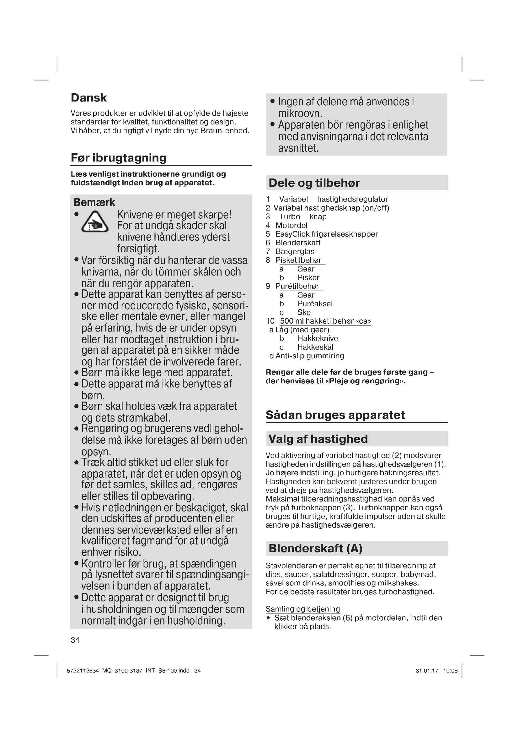 Apparaten bör rengöras i enlighet med anvisningarna i det relevanta avsnittet. Dele og tilbehør 1 Variabel hastighedsregulator 2 Variabel hastighedsknap (on/off) 3 Turbo knap 4 Motordel 5 EasyClick frigørelsesknapper 6 Blenderskaft 7 Bægerglas 8 Pisketilbehør a Gear b Pisker 9 Purétilbehør a Gear b Puréaksel c Ske 10 500 ml hakketilbehør «ca» a Låg (med gear) b Hakkeknive c Hakkeskål d Anti-slip gummiring Rengør alle dele før de bruges første gang – der henvises til «Pleje og rengøring». Sådan bruges apparatet Valg af hastighed Ved aktivering af variabel hastighed (2) modsvarer hastigheden indstillingen på hastighedsvælgeren (1). Jo højere indstilling, jo hurtigere hakningsresultat. Hastigheden kan bekvemt justeres under brugen ved at dreje på hastighedsvælgeren. Maksimal tilberedningshastighed kan opnås ved tryk på turboknappen (3). Turboknappen kan også bruges til hurtige, kraftfulde impulser uden at skulle ændre på hastighedsvælgeren. Blenderskaft (A) Stavblenderen er perfekt egnet til tilberedning af dips, saucer, salatdressinger, supper, babymad, såvel som drinks, smoothies og milkshakes. For de bedste resultater bruges turbohastighed. Samling og betjening