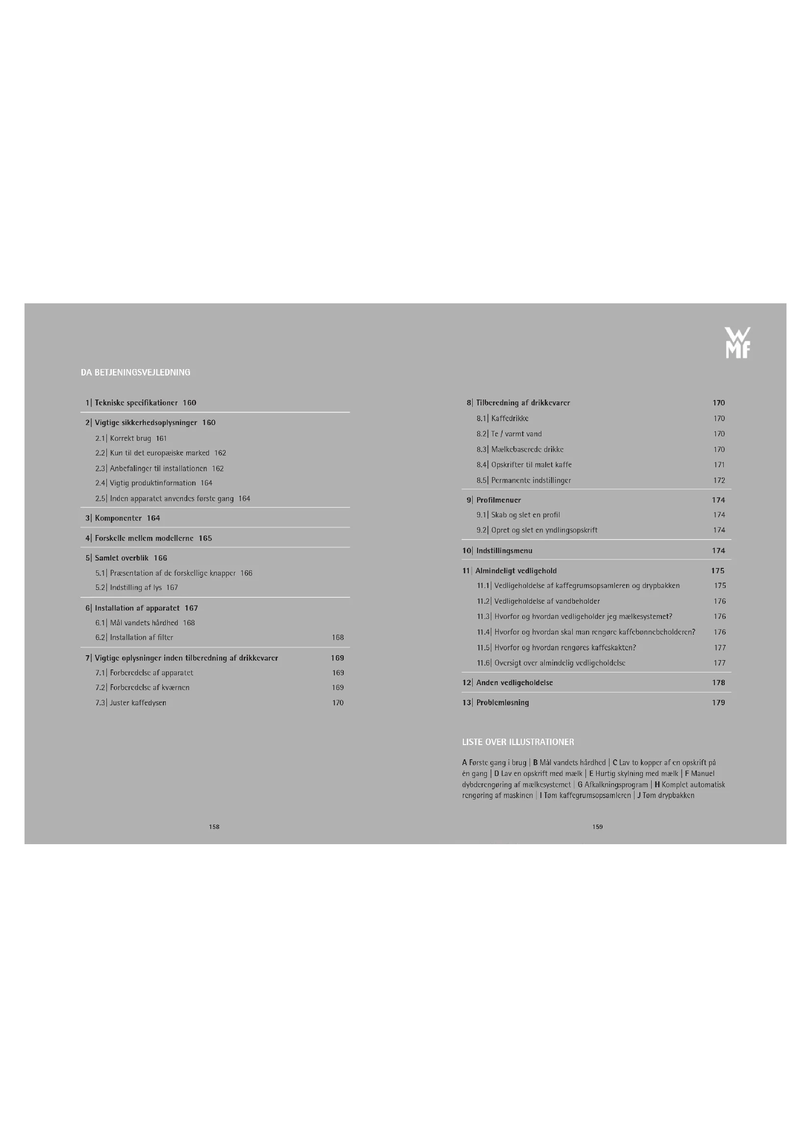 TR SV RU RO PT PL NO NL FI DA CS IT ES FR EN DEDA BETJENINGSVEJLEDNING 1|Tekniske specifikationer 160 2|Vigtige sikkerhedsoplysninger 160 2.1|Korrekt brug 161 2.2|Kun til det europæiske marked 162 2.3|Anbefalinger til installationen 162 2.4|Vigtig produktinformation 164 2.5|Inden apparatet anvendes første gang 164 3|Komponenter 164 4|Forskelle mellem modellerne 165 5|Samlet overblik 166 5.1|Præsentation af de forskellige knapper 166 5.2|Indstilling af lys 167 6|Installation af apparatet 167 6.1|Mål vandets hårdhed 168 6.2|Installation af filter 168 7|Vigtige oplysninger inden tilberedning af drikkevarer 169 7.1|Forberedelse af apparatet 169 7.2|Forberedelse af kværnen 169 7.3|Juster kaffedysen 170 8|Tilberedning af drikkevarer 170 8.1|Kaffedrikke 170 8.2|Te / varmt vand 170 8.3|Mælkebaserede drikke 170 8.4|Opskrifter til malet kaffe 171 8.5|Permanente indstillinger 172 9|Profilmenuer 174 9.1|Skab og slet en profil 174 9.2|Opret og slet en yndlingsopskrift 174 10|Indstillingsmenu 174 11|Almindeligt vedligehold 175 11.1|Vedligeholdelse af kaffegrumsopsamleren og drypbakken 175 11.2|Vedligeholdelse af vandbeholder 176 11.3|Hvorfor og hvordan vedligeholder jeg mælkesystemet? 176 11.4|Hvorfor og hvordan skal man rengøre kaffebønnebeholderen? 176 11.5|Hvorfor og hvordan rengøres kaffeskakten? 177 11.6|Oversigt over almindelig vedligeholdelse 177 12|Anden vedligeholdelse 178 13|Problemløsning 179