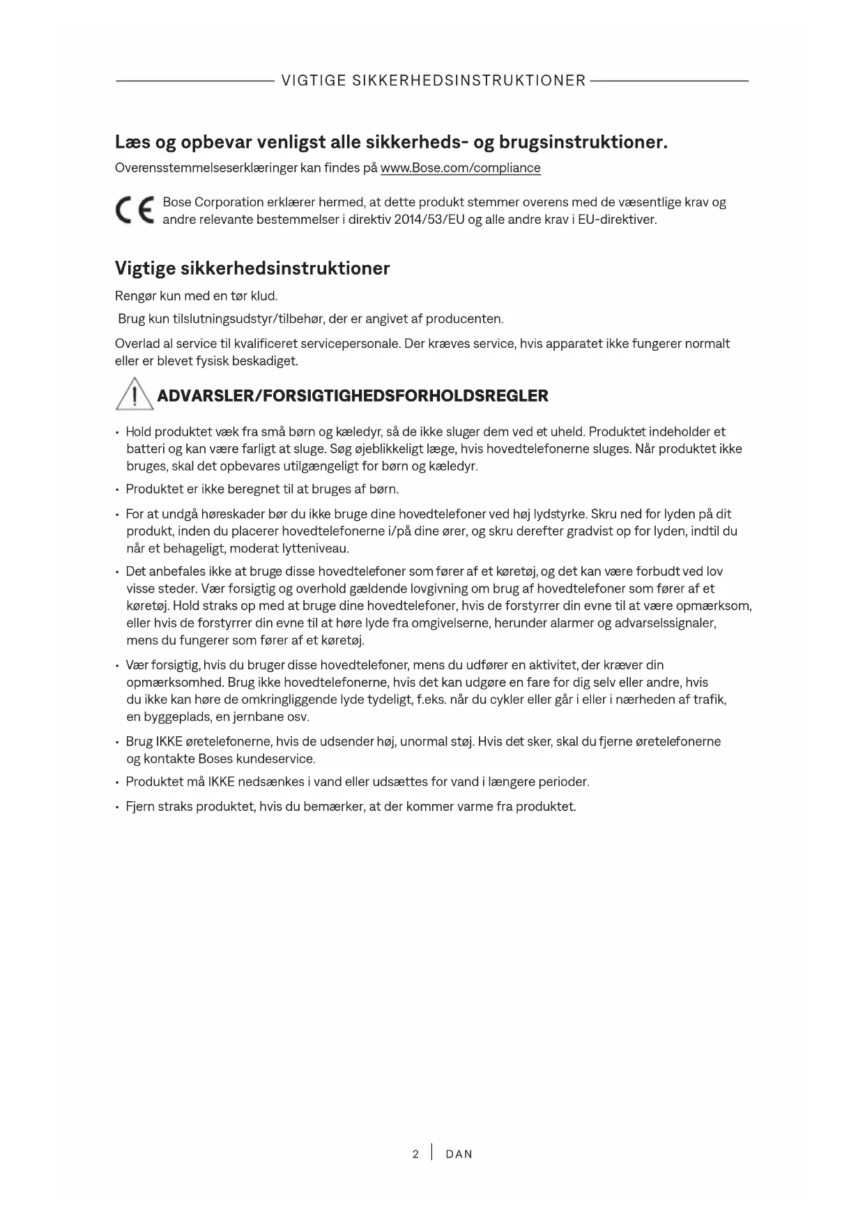 DAN Læs og opbevar venligst alle sikkerheds- og brugsinstruktioner. Overensstemmelseserklæringer kan findes på www.Bose.com/compliancewww.Bose.com/compliance Bose Corporation erklærer hermed, at dette produkt stemmer overens med de væsentlige krav og andre relevante bestemmelser i direktiv 2014/53/EU og alle andre krav i EU-direktiver. Vigtige sikkerhedsinstruktioner Rengør kun med en tør klud. Brug kun tilslutningsudstyr/tilbehør, der er angivet af producenten. Overlad al service til kvalificeret servicepersonale. Der kræves service, hvis apparatet ikke fungerer normalt eller er blevet fysisk beskadiget. ADVARSLER/FORSIGTIGHEDSFORHOLDSREGLER