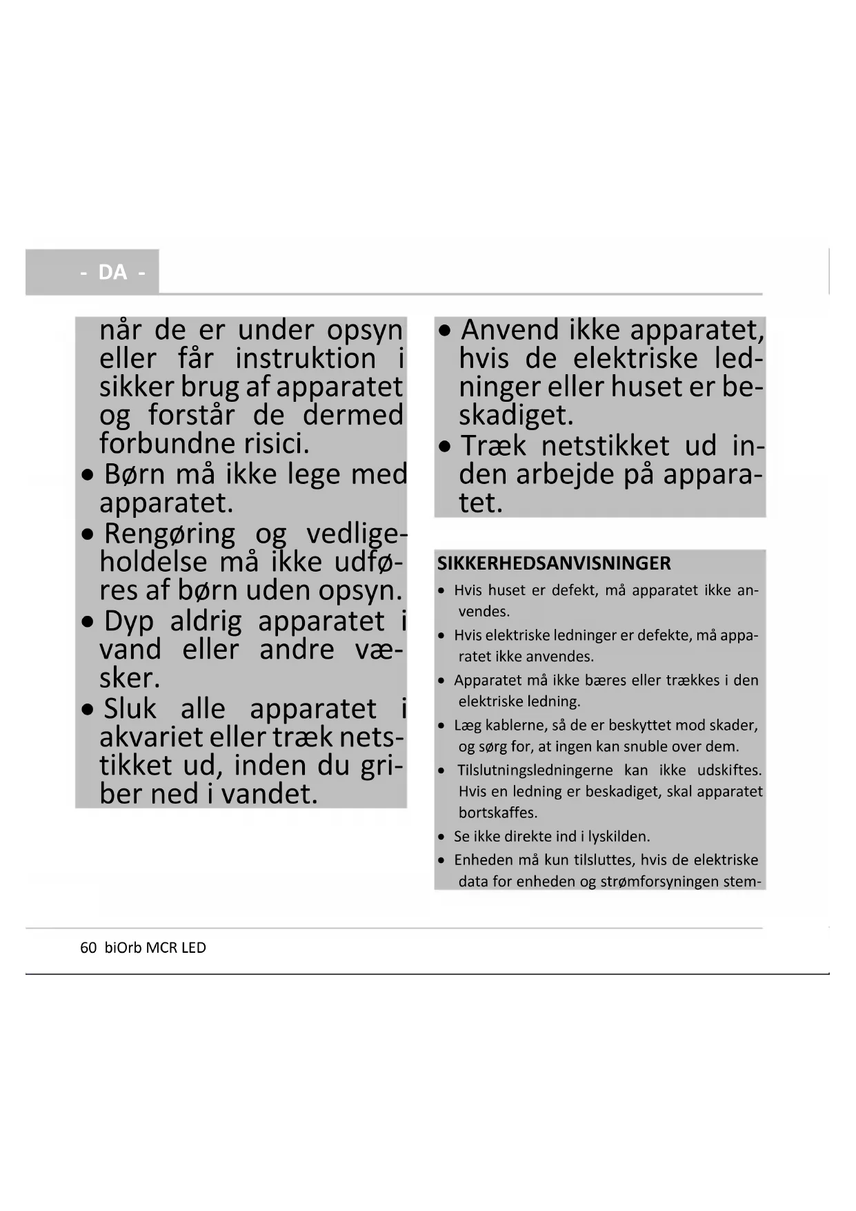 - Manglende overholdelse kan medføre lette eller mindre kvæstelser. OBS! Oplysninger, der medvirker til bedre forståelse. Yderligere anvisninger A Henvisning til en figur, f.eks. figur A. PRODUKTBESKRIVELSE Anvendelse i henhold til bestemmelser biOrb MCR LED, herefter kaldet "enheden", må udelukkende anvendes på følgende måde: Til belysning af et akvarium biOrb CLASSIC, biOrb LIFE, biOrb FLOW, biOrb TUBE.