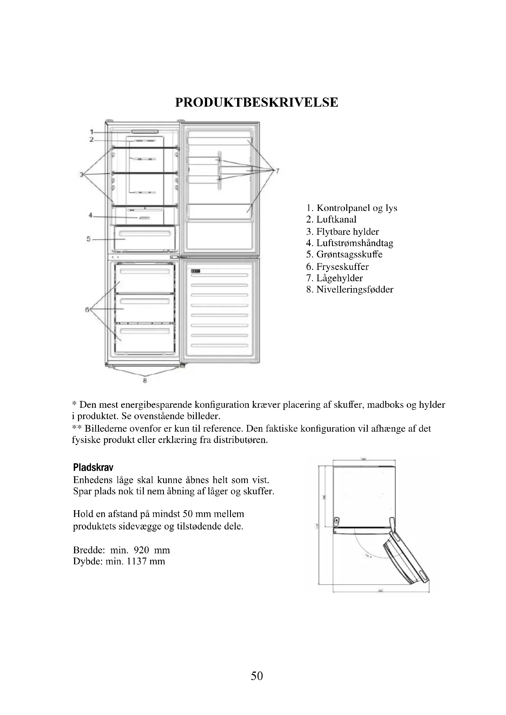 - Den mest energibesparende konfiguration kræver placering af skuffer, madboks og hylder i produktet. Se ovenstående billeder. ** Billederne ovenfor er kun til reference. Den faktiske konfiguration vil afhænge af det fysiske produkt eller erklæring fra distributøren. Pladskrav Enhedens låge skal kunne åbnes helt som vist. Spar plads nok til nem åbning af låger og skuffer. Hold en afstand på mindst 50 mm mellem produktets sidevægge og tilstødende dele. Bredde: min. 920 mm Dybde: min. 1137 mm51 BRUG Tænd/sluk-knap, der bruges til at tænde/slukke for apparatet. Indstillingstast, der bruges til at justere temperaturen eller til at vælge Super Cool-funktionen. Super Cool-icon, viser, om funktionen er aktiveret.