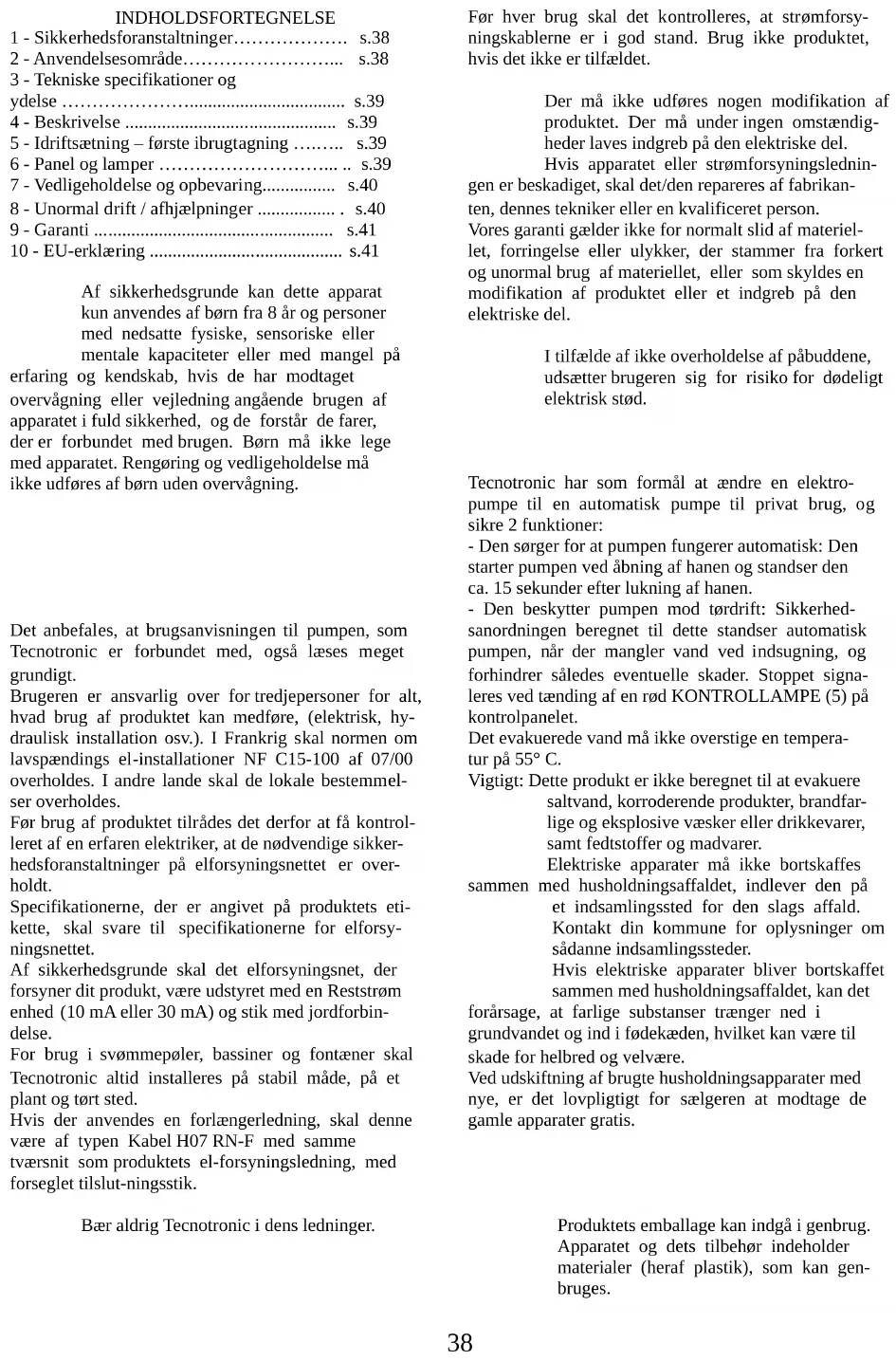 Tecnotronic har som formål at ændre en elektro- pumpe til en automatisk pumpe til privat brug, og sikre 2 funktioner: - Den sørger for at pumpen fungerer automatisk: Den starter pumpen ved åbning af hanen og standser den ca. 15 sekunder efter lukning af hanen. - Den beskytter pumpen mod tørdrift: Sikkerhed- sanordningen beregnet til dette standser automatisk pumpen, når der mangler vand ved indsugning, og forhindrer således eventuelle skader. Stoppet signa- leres ved tænding af en rød KONTROLLAMPE (5) på kontrolpanelet. Det evakuerede vand må ikke overstige en tempera- tur på 55° C. Vigtigt: Dette produkt er ikke beregnet til at evakuere saltvand, korroderende produkter, brandfar- lige og eksplosive væsker eller drikkevarer, samt fedtstoffer og madvarer. Elektriske apparater må ikke bortskaffes sammen med husholdningsaffaldet, indlever den på et indsamlingssted for den slags affald. Kontakt din kommune for oplysninger om sådanne indsamlingssteder. Hvis elektriske apparater bliver bortskaffet sammen med husholdningsaffaldet, kan det forårsage, at farlige substanser trænger ned i grundvandet og ind i fødekæden, hvilket kan være til skade for helbred og velvære. Ved udskiftning af brugte husholdningsapparater med nye, er det lovpligtigt for sælgeren at modtage de gamle apparater gratis. Produktets emballage kan indgå i genbrug. Apparatet og dets tilbehør indeholder materialer (heraf plastik), som kan gen- bruges. DK39