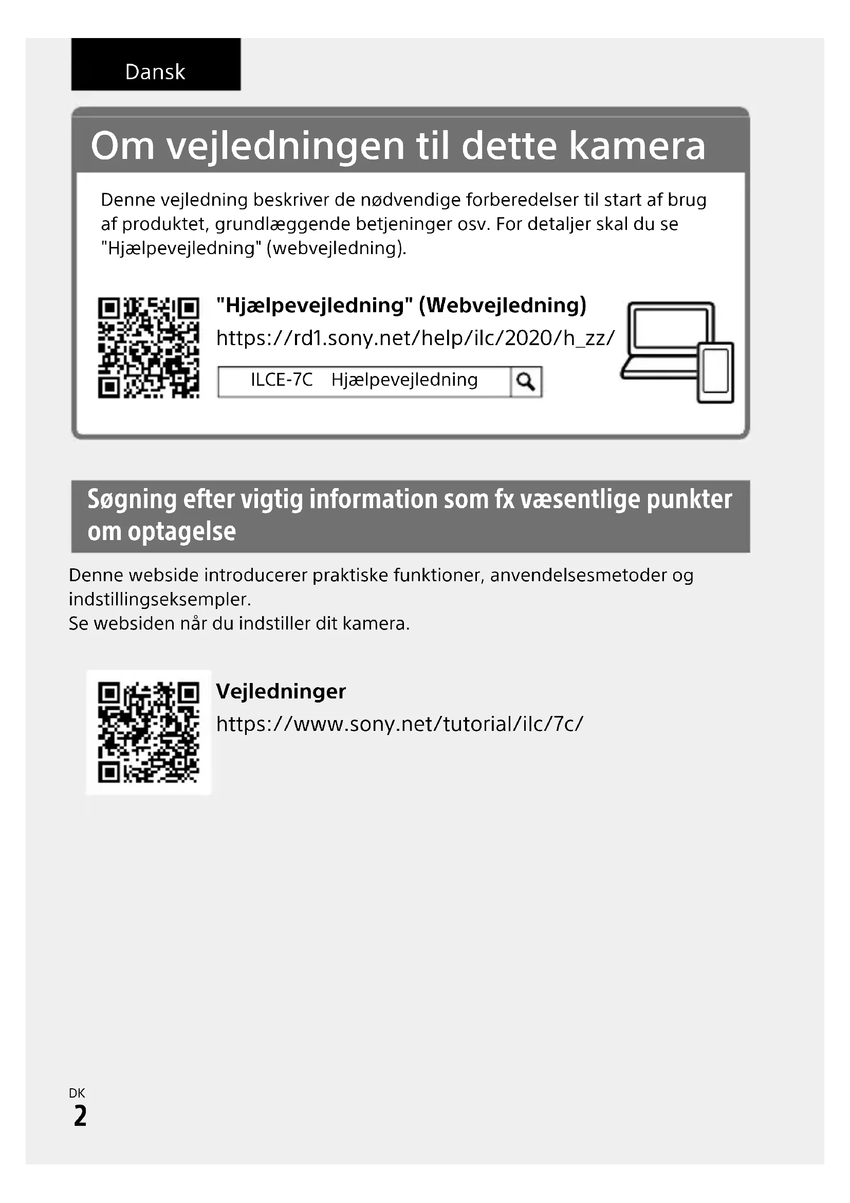 C:\0708\5021708411ILCE7CCEC\14DK-ILCE7CCEC\14DK.indd DTP data saved: 2020/06/26 09:54 PDF file created: 2020/07/08 09:15 Dansk Om vejledningen til dette kamera Denne vejledning beskriver de nødvendige forberedelser til start af brug af produktet, grundlæggende betjeninger osv. For detaljer skal du se "Hjælpevejledning" (webvejledning). https://rd1.sony.net/help/ilc/2020/h_zz/ "Hjælpevejledning" (Webvejledning) ILCE-7C Hjælpevejledning Søgning efter vigtig information som fx væsentlige punkter om optagelse Denne webside introducerer praktiske funktioner, anvendelsesmetoder og indstillingseksempler.Se websiden når du indstiller dit kamera. Vejledninger https://www.sony.net/tutorial/ilc/7c/ILCE-7C5-021-708-41(1)
