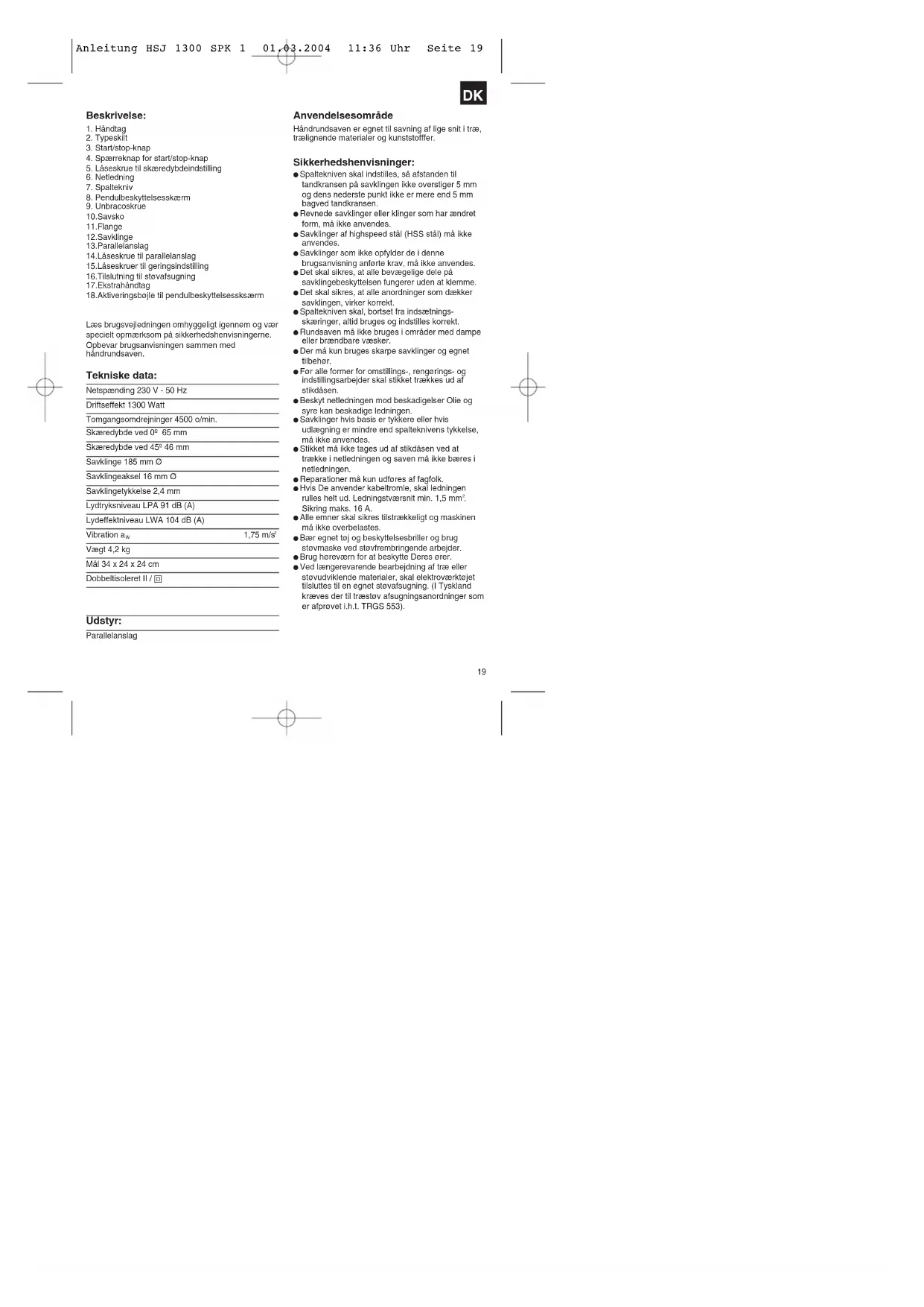 10.Savsko 11.Flange 12.Savklinge 13.Parallelanslag 14.Låseskrue til parallelanslag 15.Låseskruer til geringsindstilling 16.Tilslutning til støvafsugning 17.Ekstrahåndtag 18.Aktiveringsbøjle til pendulbeskyttelsessksærm Læs brugsvejledningen omhyggeligt igennem og vær specielt opmærksom på sikkerhedshenvisningerne. Opbevar brugsanvisningen sammen med håndrundsaven. Tekniske data: Netspænding 230 V - 50 Hz Driftseffekt 1300 Watt Tomgangsomdrejninger 4500 o/min. Skæredybde ved 0º 65 mm Skæredybde ved 45º 46 mm Savklinge 185 mm Ø Savklingeaksel 16 mm Ø Savklingetykkelse 2,4 mm Lydtryksniveau LPA 91 dB (A) Lydeffektniveau LWA 104 dB (A) Vibration a