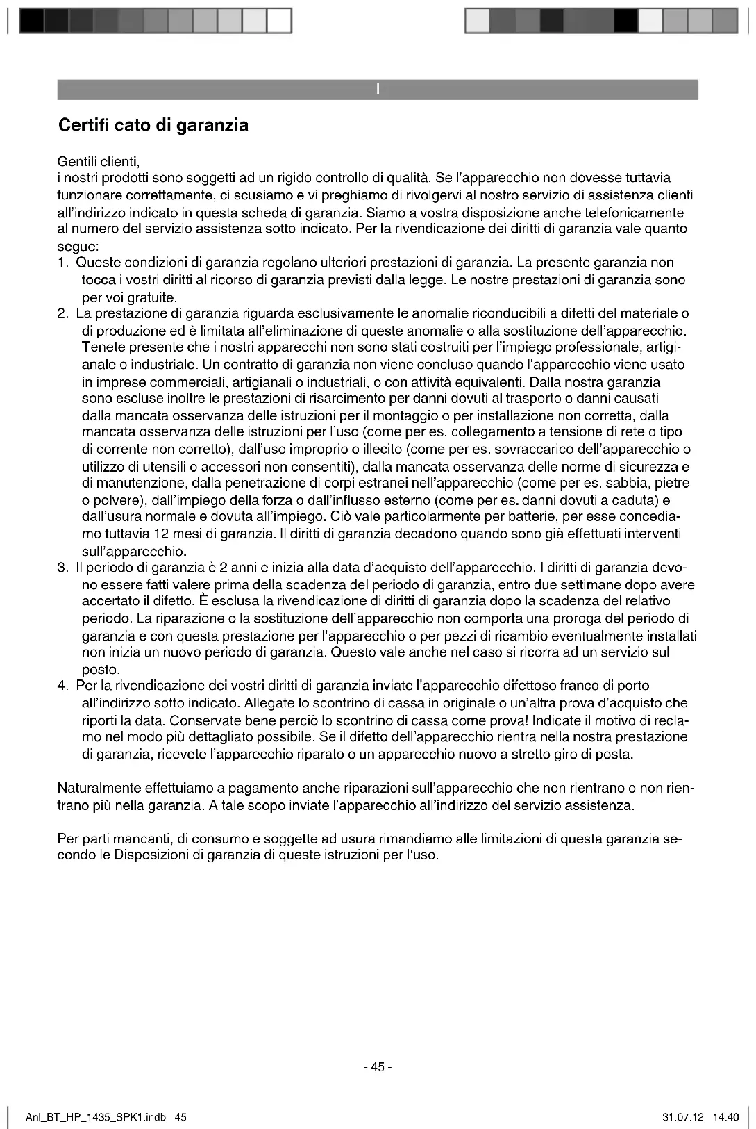 de adresse. Original købskvittering eller lignende dateret dokumentation skal vedsendes. Købskvit- teringen skal gemmes som dokumentation! Beskriv venligst så nøjagtigt som muligt grunden til din reklamation. Er defekten omfattet af garantien, vil produktet omgående blive repareret og returneret, eller du vil modtage et helt nyt. Mod betaling udbedrer vi naturligvis også gerne defekter på produktet, som ikke/ikke længere er omfat- tet af garantien. Du skal blot indsende produktet til vores serviceadresse. Hvad angår slid- og forbrugsdele samt manglende dele henviser vi til garantiens begrænsninger i hen- hold til garantibestemmelserne i nærværende betjeningsvejledning. Anl_BT_HP_1435_SPK1.indb 54Anl_BT_HP_1435_SPK1.indb 54 31.07.12 14:4031.07.12 14:40S