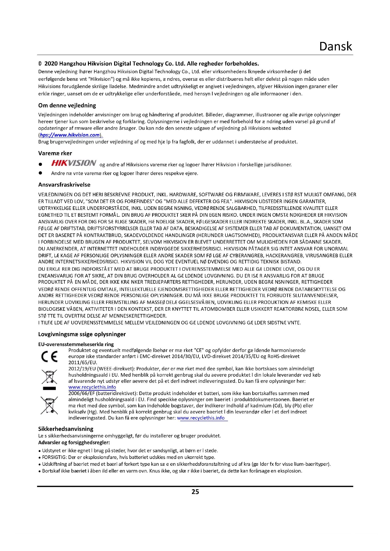 2006/66/EF (batteridirektivet): Dette produkt indeholder et batteri, som ikke kan bortskaffes sammen med almindeligt husholdningsaffald i EU. Find specifikke oplysninger om batteriet i produktdokumentationen. Batteriet er mæ rket med dette symbol, som kan indeholde bogstaver, der indikerer indhold af kadmium (Cd), bly (Pb) eller kviksølv (Hg). Med henblik på korrekt genbrug skal du aflevere batteriet til din leverandør eller til et dertil indrettet indleveringssted. Du kan få flere oplysninger her: www.recyclethis.info Sikkerhedsanvisning Læ s sikkerhedsanvisningerne omhyggeligt, før du installerer og bruger produktet. Advarsler og forsigtighedsregler: ● Udstyret er ikke egnet til brug på steder, hvor det er sandsynligt, at børn er til stede. ● FORSIGTIG: Der er eksplosionsfare, hvis batteriet udskiftes med en ukorrekt type. ● Udskiftning af batteriet med et batteri af forkert type kan sæ tte en sikkerhedsforanstaltning ud af kraft (gæ lder fx for visse litium-batterityper). ● Bortskaf ikke batteriet i åben ild eller en varm ovn. Knus ikke, og skæ r ikke i batteriet, da dette kan forårsage en eksplosion.Dansk