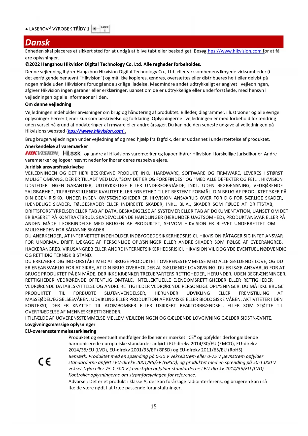 Produktet og eventuelt medfølgende tilbehør er mærket "CE" og opfylder derfor gældende harmoniserede europæiske standarder anført i EU-direktiv 2014/30/EU (EMCD), EU-direktiv 2014/35/EU (LVD), EU-direktiv 2001/95/EF (GPSD) og EU-direktiv 2011/65/EU (RoHS). Bemærk: Produktet med en spænding på 0-50 V vekselstrøm eller 0-75 V jævnstrøm opfylder standarderne anført i EU-direktiv 2001/95/EF (GPSD), og produktet med en spænding på 50-1.000 V vekselstrøm eller 75-1.500 V jævnstrøm opfylder standarderne i EU-direktiv 2014/35/EU (LVD). Kontrollér oplysningerne om strømforsyningen for reference. Advarsel: Det er et produkt i klasse A, der kan forårsage radiointerferens, og brugeren kan i så tilfælde være nødt til at træffe passende foranstaltninger.16