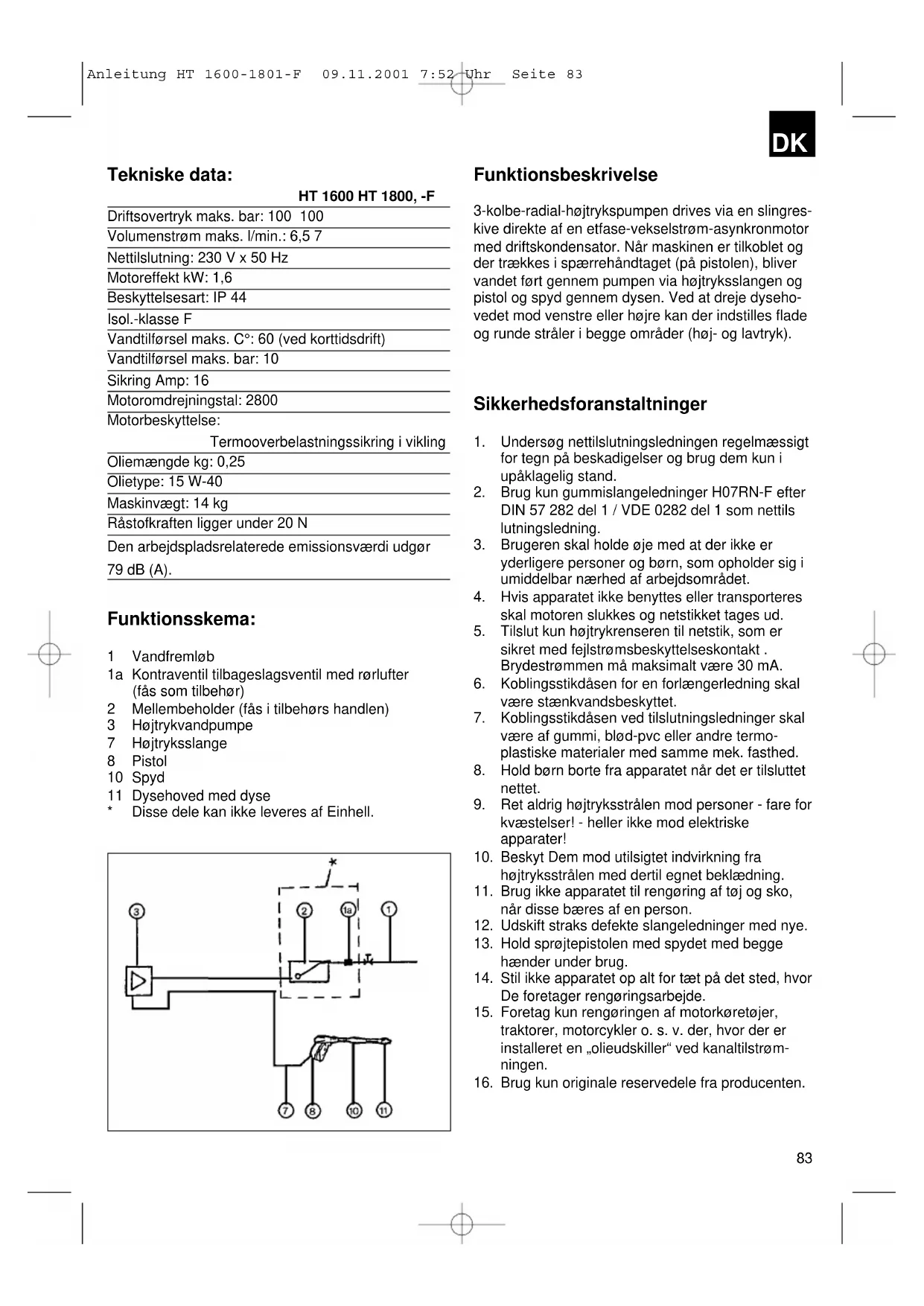 Tekniske data: HT 1600 HT 1800, -F Driftsovertryk maks. bar: 100 100 Volumenstrøm maks. l/min.: 6,5 7 Nettilslutning: 230 V x 50 Hz Motoreffekt kW: 1,6 Beskyttelsesart: IP 44 Isol.-klasse F Vandtilførsel maks. C°: 60 (ved korttidsdrift) Vandtilførsel maks. bar: 10 Sikring Amp: 16 Motoromdrejningstal: 2800 Motorbeskyttelse: Termooverbelastningssikring i vikling Oliemængde kg: 0,25 Olietype: 15 W-40 Maskinvægt: 14 kg Råstofkraften ligger under 20 N Den arbejdspladsrelaterede emissionsværdi udgør 79 dB (A). Funktionsskema: 1 Vandfremløb 1a Kontraventil tilbageslagsventil med rørlufter (fås som tilbehør) 2 Mellembeholder (fås i tilbehørs handlen) 3 Højtrykvandpumpe 7 Højtryksslange 8 Pistol 10 Spyd 11 Dysehoved med dyse
