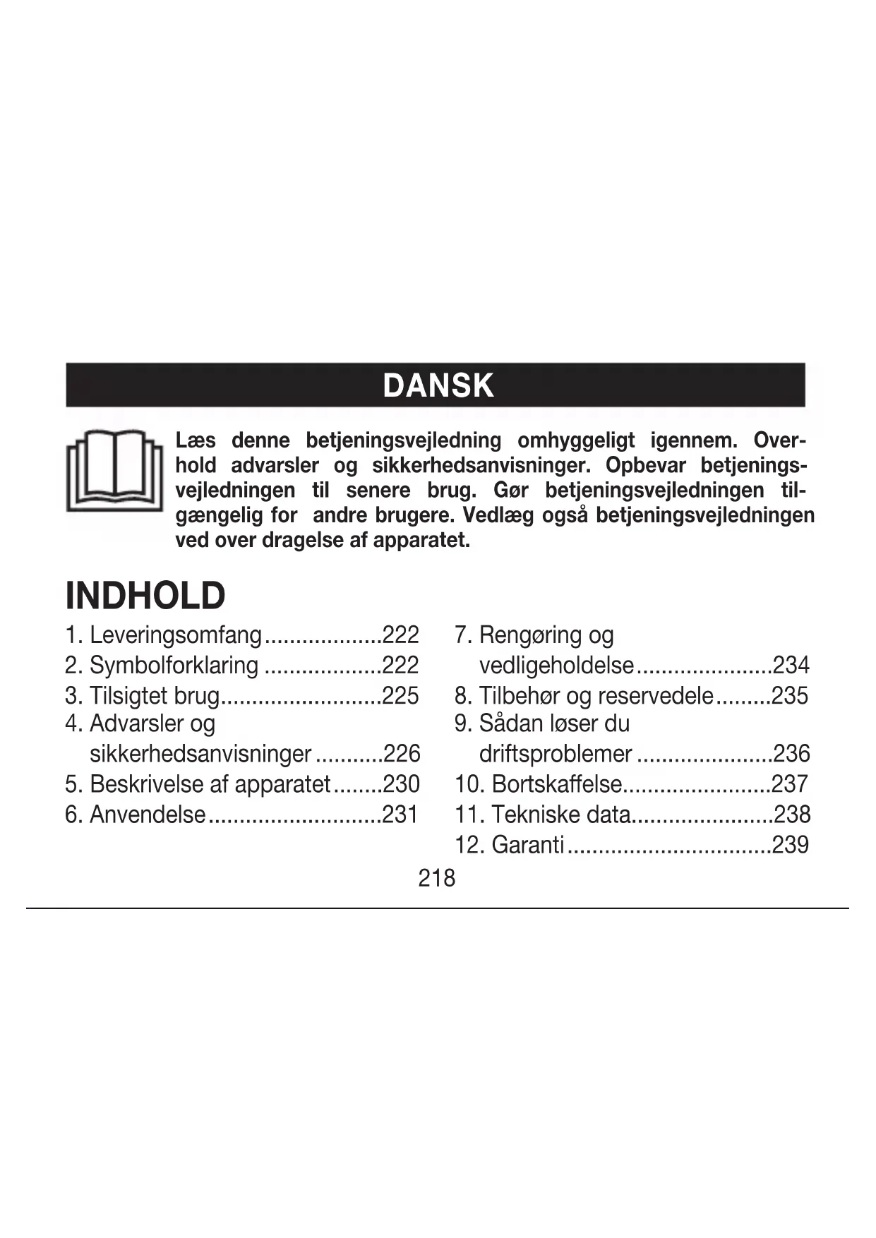 Meer informatie over de garantie en de garantievoorwaarden vindt u in het meegeleverde garantieblad. Fouten en wijzigingen voorbehouden218 Læs denne betjeningsvejledning omhyggeligt igennem. Over- hold advarsler og sikkerhedsanvisninger. Opbevar betjenings- vejledningen til senere brug. Gør betjeningsvejledningen til- gængelig for andre brugere. Vedlæg også betjeningsvejledningen ved over dragelse af apparatet.