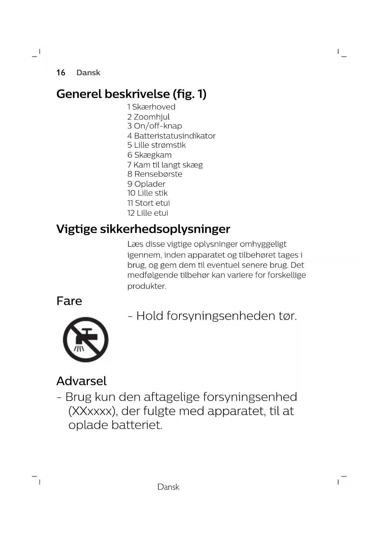 EnglishDansk Generel beskrivelse (fig. 1) 1 Skærhoved 2 Zoomhjul 3 On/off-knap 4 Batteristatusindikator 5 Lille strømstik 6 Skægkam 7 Kam til langt skæg 8 Rensebørste 9 Oplader 10 Lille stik 11 Stort etui 12 Lille etui Vigtige sikkerhedsoplysninger Læs disse vigtige oplysninger omhyggeligt igennem, inden apparatet og tilbehøret tages i brug, og gem dem til eventuel senere brug. Det medfølgende tilbehør kan variere for forskellige produkter. Fare - Hold forsyningsenheden tør. Advarsel - Brug kun den aftagelige forsyningsenhed (XXxxxx), der fulgte med apparatet, til at oplade batteriet.