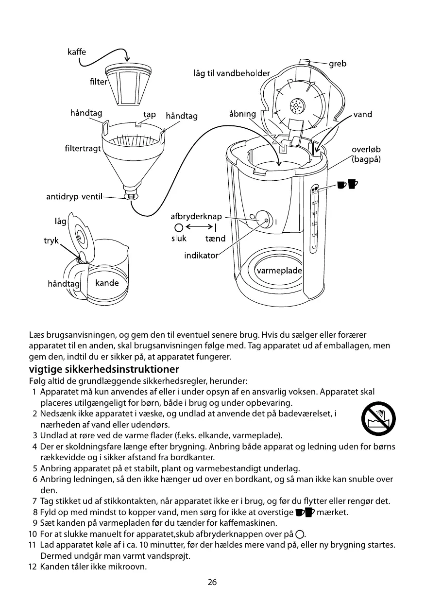 2 N’immergez pas l’appareil dans un liquide, ne l’utilisez pas dans une salle de bains, à proximité d’une source d’eau ou à l’extérieur. 3 Ne touchez pas les surfaces chaudes ( la carafe, la plaque chauffante). 4 Le risque de brûlure persiste longtemps après ébullition. Tenez l’appareil et le câble loin des bords des surfaces de travail et hors de portée des enfants. 5 Posez l’appareil sur une surface stable, à niveau et résistante à la chaleur. 6 Branchez le cordon de sorte qu’il ne pende pas et qu’il n’y ait aucun risque de trébucher dessus. 7 Débranchez l’appareil lorsque vous ne l’utilisez pas, avant de le déplacer et avant de le nettoyer. 8 Remplissez le réservoir avec 2 tasses au minimum, mais sans dépasser la marque ;:. 9 Placez la carafe sur la plaque chauffante avant d’allumer la cafetière. 10 Si vous voulez arrêter la machine pendant la préparation du café, mettez l’interrupteur sur 0. 11 Laissez l’appareil refroidir au moins 10 minutes avant de rajouter de l’eau ou de le réutiliser afin d’éviter toute projection. 12 Ne mettez pas la carafe au four micro-ondes. 13 N’essayez pas de régler la bande métallique autour de la carafe, le verre casserait. 14 Placez l’appareil et le cordon loin des plaques chauffantes, des plans de cuisson ou des brûleurs. 15 N’adaptez pas d’accessoires autres que ceux fournis. 6