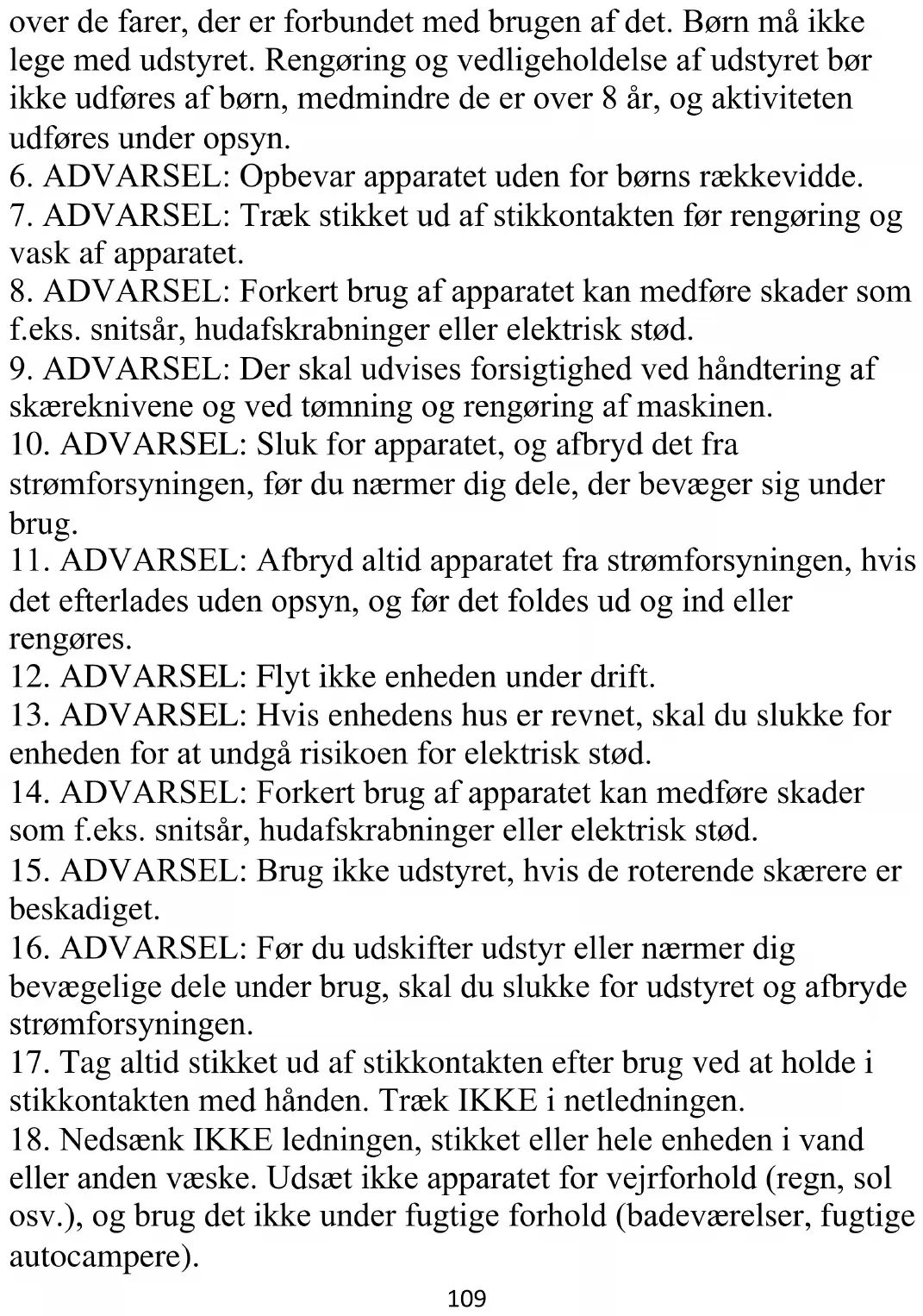 8. ADVARSEL: Forkert brug af apparatet kan medføre skader som