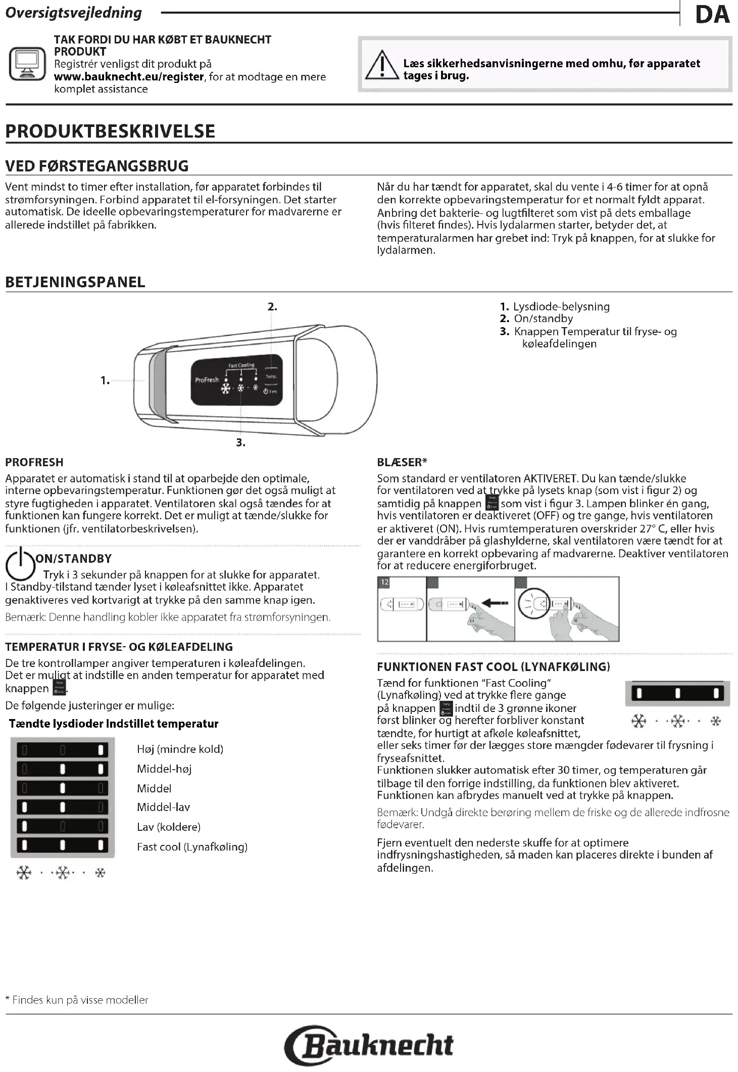 PROFRESH Apparatet er automatisk i stand til at oparbejde den optimale, interne opbevaringstemperatur. Funktionen gør det også muligt at styre fugtigheden i apparatet. Ventilatoren skal også tændes for at funktionen kan fungere korrekt. Det er muligt at tænde/slukke for funktionen (jfr. ventilatorbeskrivelsen). ON/STANDBY Tryk i 3 sekunder på knappen for at slukke for apparatet. I Standby-tilstand tænder lyset i køleafsnittet ikke. Apparatet genaktiveres ved kortvarigt at trykke på den samme knap igen. Bemærk: Denne handling kobler ikke apparatet fra strømforsyningen.