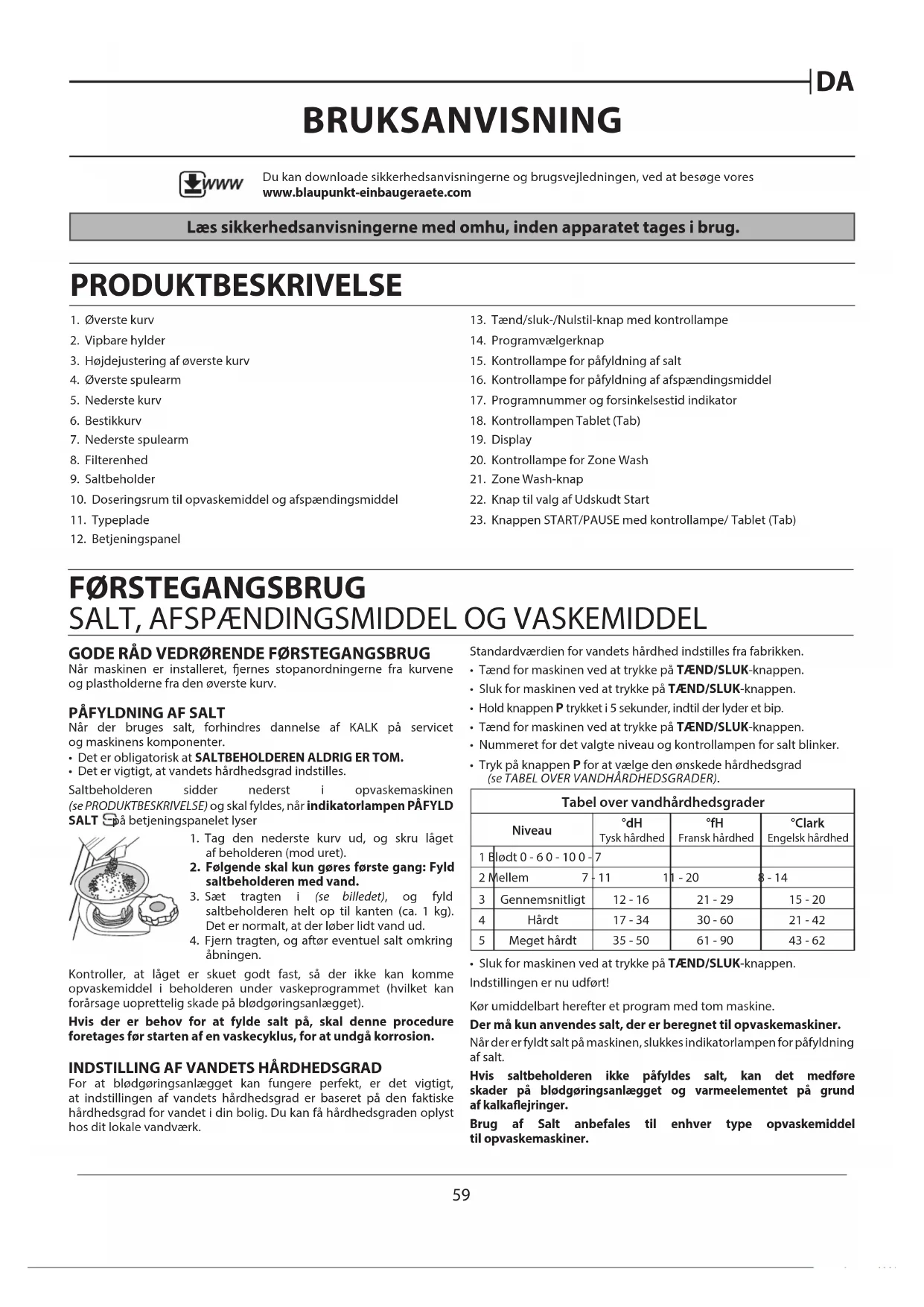 BRUKSANVISNING Læs sikkerhedsanvisningerne med omhu, inden apparatet tages i brug. PRODUKTBESKRIVELSE 1. Øverste kurv2. Vipbare hylder3. Højdejustering af øverste kurv4. Øverste spulearm5. Nederste kurv6. Bestikkurv7. Nederste spulearm8. Filterenhed9. Saltbeholder10. Doseringsrum til opvaskemiddel og afspændingsmiddel11. Typeplade12. Betjeningspanel13. Tænd/sluk-/Nulstil-knap med kontrollampe14. Programvælgerknap15. Kontrollampe for påfyldning af salt16. Kontrollampe for påfyldning af afspændingsmiddel17. Programnummer og forsinkelsestid indikator18. Kontrollampen Tablet (Tab) 19. Display20. Kontrollampe for Zone Wash21. Zone Wash-knap22. Knap til valg af Udskudt Start23. Knappen START/PAUSE med kontrollampe/ Tablet (Tab) FØRSTEGANGSBRUG