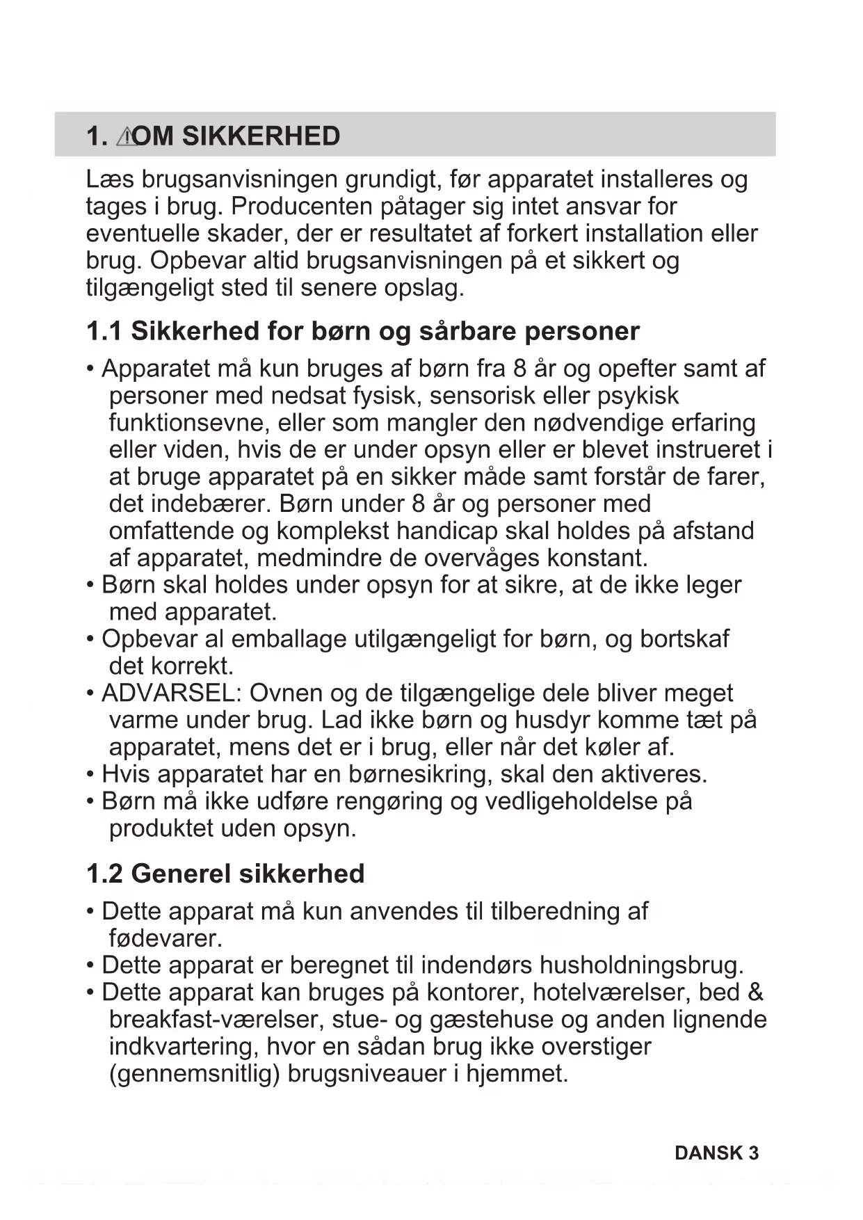 - Apparatet må kun bruges af børn fra 8 år og opefter samt af personer med nedsat fysisk, sensorisk eller psykisk funktionsevne, eller som mangler den nødvendige erfaring eller viden, hvis de er under opsyn eller er blevet instrueret i at bruge apparatet på en sikker måde samt forstår de farer, det indebærer. Børn under 8 år og personer med omfattende og komplekst handicap skal holdes på afstand af apparatet, medmindre de overvåges konstant.