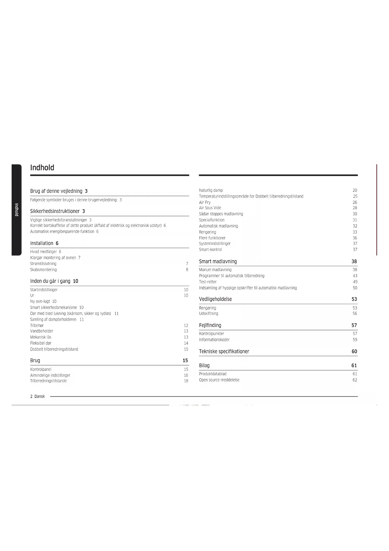Chamada para a rede xa nacional Dias úteis das 9h às 20h www.samsung.com/pt/support SPAIN 91 175 00 15 www.samsung.com/es/support SWEDEN 0771-400 300 www.samsung.com/se/support SWITZERLAND 0800 726 786 www.samsung.com/ch/support (German) www.samsung.com/ch_fr/support (French) UK 0333 000 0333 www.samsung.com/uk/support IRELAND (EIRE) 0818 717100 www.samsung.com/ie/support DG68-01412A-04Indbygget ovn Bruger- & installationsvejledning NV7B564**** / NV7B565**** / NV7B566**** / NV7B567**** / NV7B568**** / NV7B564**C* / NV7B566**C* / NV7B568**C* / NV7B574**** / NV7B575**** / NV7B576**** / NV7B577**** / NV7B578****2 Dansk Indhold Indhold Brug af denne vejledning 3 Følgende symboler bruges i denne brugervejledning: 3 Sikkerhedsinstruktioner 3 Vigtige sikkerhedsforanstaltninger 3 Korrekt bortskaffelse af dette produkt (Affald af elektrisk og elektronisk udstyr) 6 Automatisk energibesparende funktion 6 Installation 6 Hvad medfølger 6 Klargør montering af ovnen 7 Strømtilslutning 7 Skabsmontering 8 Inden du går i gang 10 Startindstillinger 10 Ur 10 Ny ovn-lugt 10 Smart sikkerhedsmekanisme 10 Dør med blød lukning (skånsom, sikker og lydløs) 11 Samling af dampbeholderen 11 Tilbehør 12 Vandbeholder 13 Mekanisk lås 13 Fleksibel dør 14 Dobbelt tilberedningstilstand 15 Brug 15 Kontrolpanel 15 Almindelige indstillinger 16 Tilberedningstilstande 18 Naturlig damp 20 Temperaturindstillingsområde for Dobbelt tilberedningstilstand 25 Air Fry 26 Air Sous Vide 28 Sådan stoppes madlavning 30 Specialfunktion 31 Automatisk madlavning 32 Rengøring 33 Flere funktioner 36 Systemindstillinger 37 Smart-kontrol 37 Smart madlavning 38 Manuel madlavning 38 Programmer til automatisk tilberedning 43 Test-retter 49 Indsamling af hyppige opskrifter til automatisk madlavning 50 Vedligeholdelse 53 Rengøring 53 Udskiftning 56 Fejlnding 57 Kontrolpunkter 57 Informationskoder 59 Tekniske specikationer 60 Bilag 61 Produktdatablad 61 Open source-meddelelse 62Dansk 3 Brug af denne vejledning Brug af denne vejledning Tak fordi du valgte SAMSUNG Indbygningsovn. Denne brugervejledning indeholder vigtige oplysninger om sikkerhed og instruktioner, der skal hjælpe dig med betjening og vedligeholdelse af dit apparat. Tag dig tid til at læse denne brugervejledning, før du bruger din ovn, og gem denne bog til fremtidig reference. Følgende symboler bruges i denne brugervejledning: ADVARSEL Farer eller usikker anvendelse, der kan resultere i alvorlig personskade, dødsfald og/eller ejendomsskade. FORSIGTIG Farer eller usikker anvendelse, der kan resultere i personskade og/eller ejendomsskade. BEMÆRK Nyttige tips, anbefalinger eller oplysninger, der hjælper brugere med at anvende produktet. Sikkerhedsinstruktioner Installation af denne ovn må kun udføres af en autoriseret elektriker. Installatøren er ansvarlig for at tilslutte apparatet til lysnettet under overholdelse af de relevante sikkerhedsanbefalinger. VIGTIGE SIKKERHEDSFORANSTALTNINGER ADVARSEL Dette apparat er ikke beregnet til at blive brugt af personer (inklusive børn) med nedsatte fysiske, sensoriske eller mentale evner eller mangel på erfaring og viden, medmindre de er under opsyn eller har fået instruktion i brugen af apparatet af en person, der er ansvarlig for deres sikkerhed. Børn skal være under opsyn for at sikre, at de ikke leger med apparatet. Midlerne til frakobling skal være indbygget i den faste ledning i overensstemmelse med ledningsreglerne. Dette apparat skal kunne afbryde forbindelsen fra forsyningen efter installation. Frakoblingen kan opnås ved at have stikket tilgængeligt eller ved at indbygge en kontakt i det faste ledningsnet i overensstemmelse med ledningsreglerne. Hvis ledningen er beskadiget, skal den udskiftes af producenten, dennes serviceagent eller lignende kvalicerede personer for at undgå en fare.4 Dansk Sikkerhedsinstruktioner Sikkerhedsinstruktioner Den angivne fastgørelsesmetode skal ikke afhænge af brugen af klæbemidler, da de ikke anses for at være et pålideligt kseringsmiddel. Dette apparat kan bruges af børn fra 8 år og derover og personer med nedsatte fysiske, sensoriske eller mentale evner eller manglende erfaring og viden, hvis de er under opsyn eller har fået instruktion i brugen af apparatet på en sikker måde og forstår farerne. involveret. Børn må ikke lege med apparatet. Rengøring og brugervedligeholdelse må ikke udføres af børn uden opsyn. Hold apparatet og dets ledning utilgængeligt for børn under 8 år. Under brug bliver apparatet varmt. Vær omhyggelig med at undgå at røre ved varmeelementerne inde i ovnen. ADVARSEL: Tilgængelige dele kan blive varme under brug. Små børn bør holdes væk. Brug ikke skrappe slibende rengøringsmidler eller skarpe metalskrabere til at rense ovndørens glas, da de kan ridse overaden, hvilket kan resultere i, at glasset knuses. Hvis dette apparat har rensefunktion, skal overskydende spild ernes før rengøring, og der bør ikke efterlades nogen redskaber i ovnen under damprensning eller selvrens. Rengøringsfunktionen afhænger af modellen. Hvis dette apparat har rengøringsfunktion, kan overaderne under rengøringsforhold blive varmere end normalt, og børn bør holdes væk. For apparater med pyrolytisk rengøringsproces kan nogle dyr, især fugle, være følsomme over for dampe og lokale temperatursvingninger under den pyrolytiske rengøringsproces og bør yttes til et passende godt ventileret område under denne proces. Udluft rummet under og efter den pyrolytiske rengøringsproces. Rengøringsfunktionen afhænger af modellen. Brug kun den temperatursonde, der anbefales til denne ovn. (Kun model med kødtermometer) En damprenser må ikke bruges. ADVARSEL: Sørg for, at apparatet er slukket, før du udskifter lampen for at undgå muligheden for elektrisk stød. Apparatet må ikke installeres bag en pyntedør for at undgå overophedning. ADVARSEL: Apparatet og dets tilgængelige dele bliver varme under brug. Vær forsigtig og undgå at røre ved va