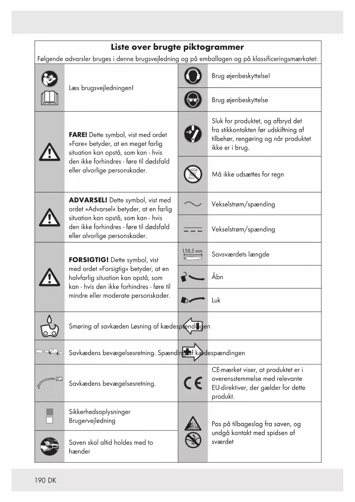 Liste over brugte piktogrammer Følgende advarsler bruges i denne brugsvejledning og på emballagen og på klassificeringsmærkatet: Læs brugsvejledningen! Brug øjenbeskyttelse! Brug øjenbeskyttelse FARE! Dette symbol, vist med ordet »Fare« betyder, at en meget farlig situation kan opstå, som kan - hvis den ikke forhindres - føre til dødsfald eller alvorlige personskader. Sluk for produktet, og afbryd det fra stikkontakten før udskiftning af tilbehør, rengøring og når produktet ikke er i brug. Må ikke udsættes for regn ADVARSEL! Dette symbol, vist med ordet »Advarsel« betyder, at en farlig situation kan opstå, som kan - hvis den ikke forhindres - føre til dødsfald eller alvorlige personskader. Vekselstrøm/spænding Vekselstrøm/spænding FORSIGTIG! Dette symbol, vist med ordet »Forsigtig« betyder, at en halvfarlig situation kan opstå, som kan - hvis den ikke forhindres - føre til mindre eller moderate personskader. 158,5 mm Savsværdets længde Åbn Luk Smøring af savkæden Løsning af kædespændingen Savkædens bevægelsesretning. Spænding af kædespændingen Savkædens bevægelsesretning. CE-mærket viser, at produktet er i overensstemmelse med relevante EU-direktiver, der gælder for dette produkt. Sikkerhedsoplysninger Brugervejledning Pas på tilbageslag fra saven, og undgå kontakt med spidsen af sværdet Saven skal altid holdes med to hænder191