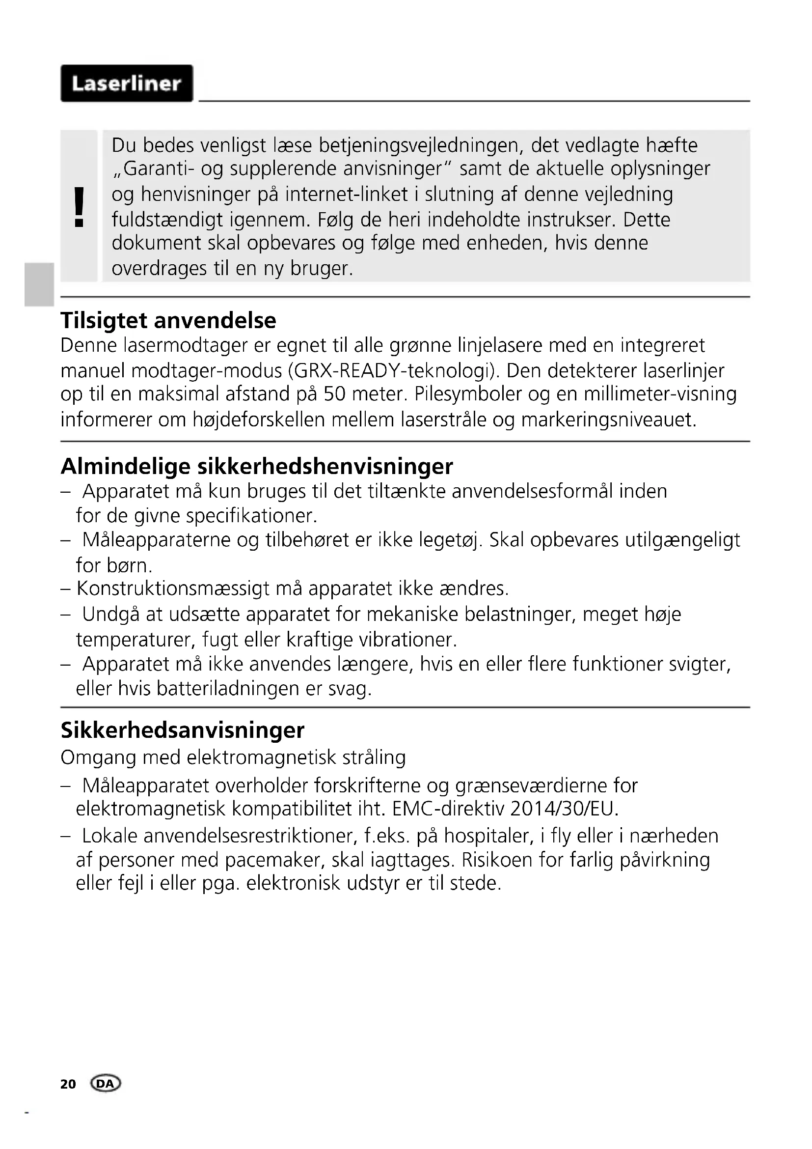 Tilsigtet anvendelse Denne lasermodtager er egnet til alle grønne linjelasere med en integreret manuel modtager-modus (GRX-READY-teknologi). Den detekterer laserlinjer op til en maksimal afstand på 50 meter. Pilesymboler og en millimeter-visning informerer om højdeforskellen mellem laserstråle og markeringsniveauet. Sikkerhedsanvisninger Omgang med elektromagnetisk stråling – Måleapparatet overholder forskrifterne og grænseværdierne for elektromagnetisk kompatibilitet iht. EMC-direktiv 2014/30/EU. – Lokale anvendelsesrestriktioner, f.eks. på hospitaler, i y eller i nærheden af personer med pacemaker, skal iagttages. Risikoen for farlig påvirkning eller fejl i eller pga. elektronisk udstyr er til stede. Almindelige sikkerhedshenvisninger – Apparatet må kun bruges til det tiltænkte anvendelsesformål inden for de givne specikationer. – Måleapparaterne og tilbehøret er ikke legetøj. Skal opbevares utilgængeligt for børn. – Konstruktionsmæssigt må apparatet ikke ændres. – Undgå at udsætte apparatet for mekaniske belastninger, meget høje temperaturer, fugt eller kraftige vibrationer. – Apparatet må ikke anvendes længere, hvis en eller ere funktioner svigter, eller hvis batteriladningen er svag. DARangeXtender M 50